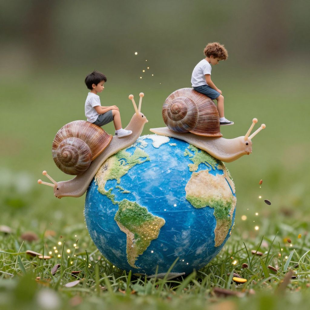 Children ride giant, snail-shaped satellites as they orbit a miniature version of the Earth, planting glowing seeds into the planet's skin.