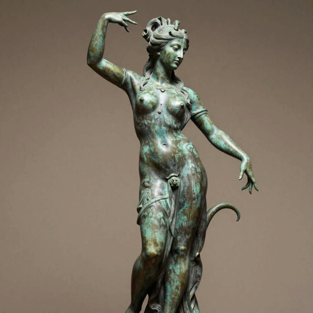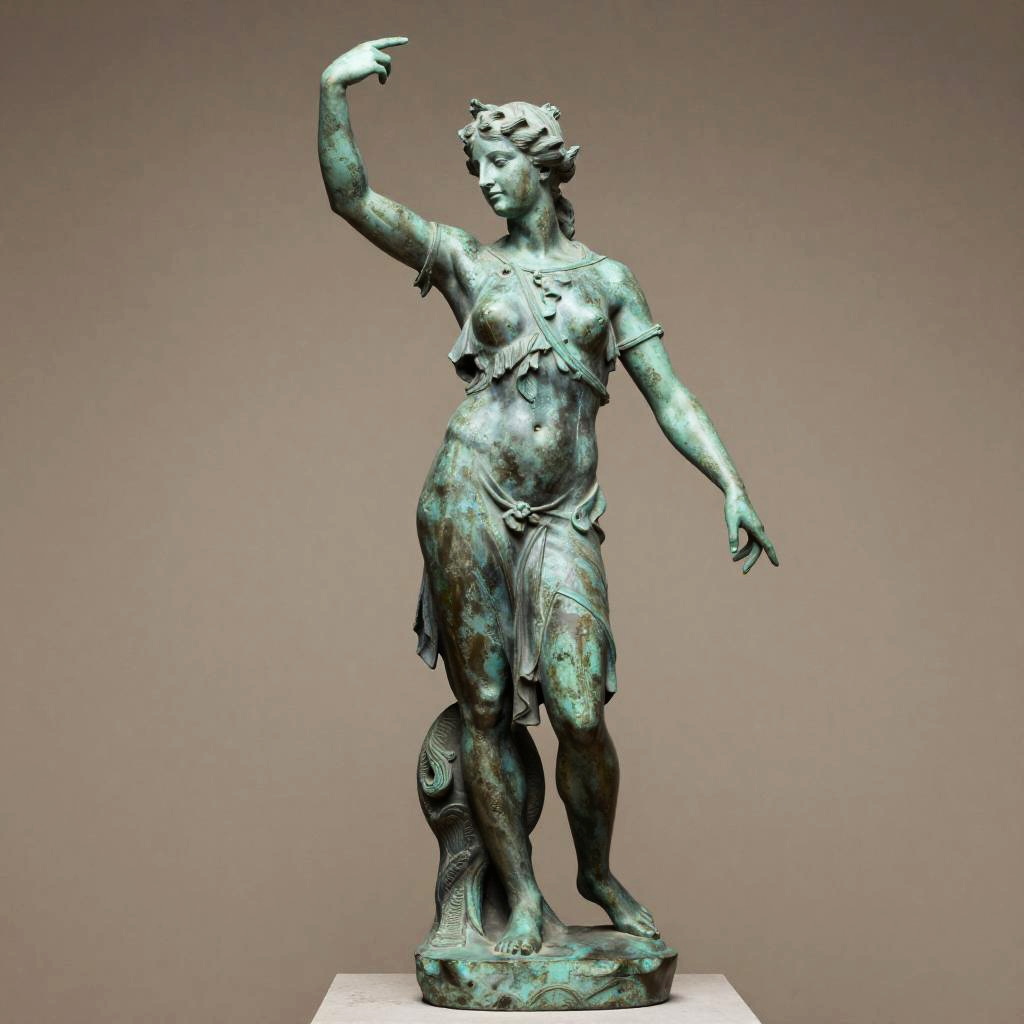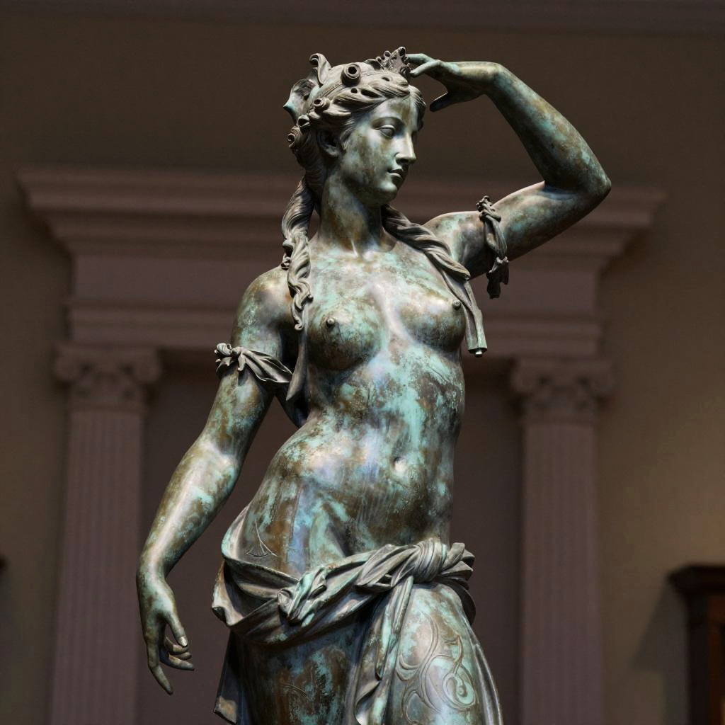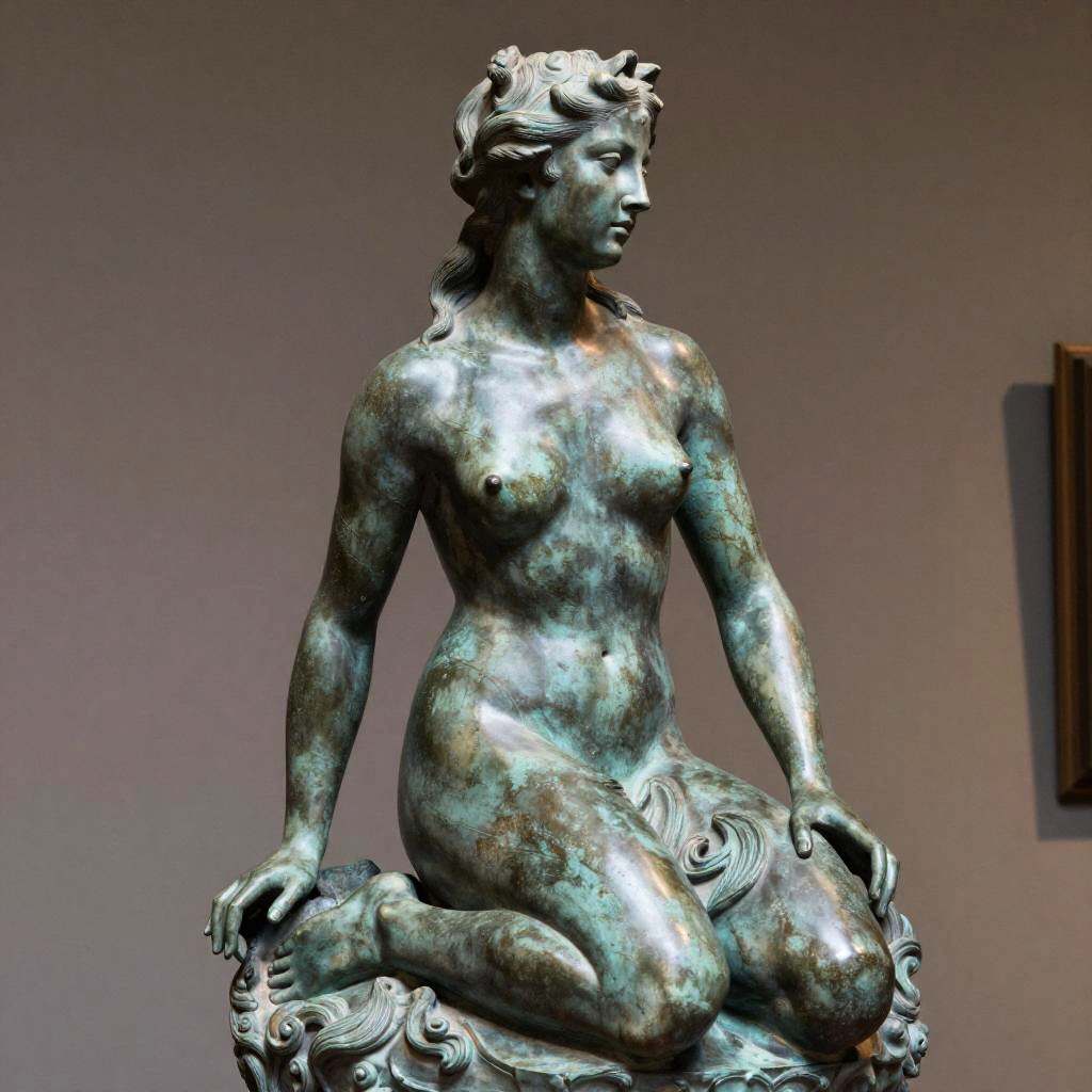 Detailed photo of an old bronze patina statue of captivating siren, full body portrait, various sensuous poses, photorealism, intricate detail, museum diffuse lighting