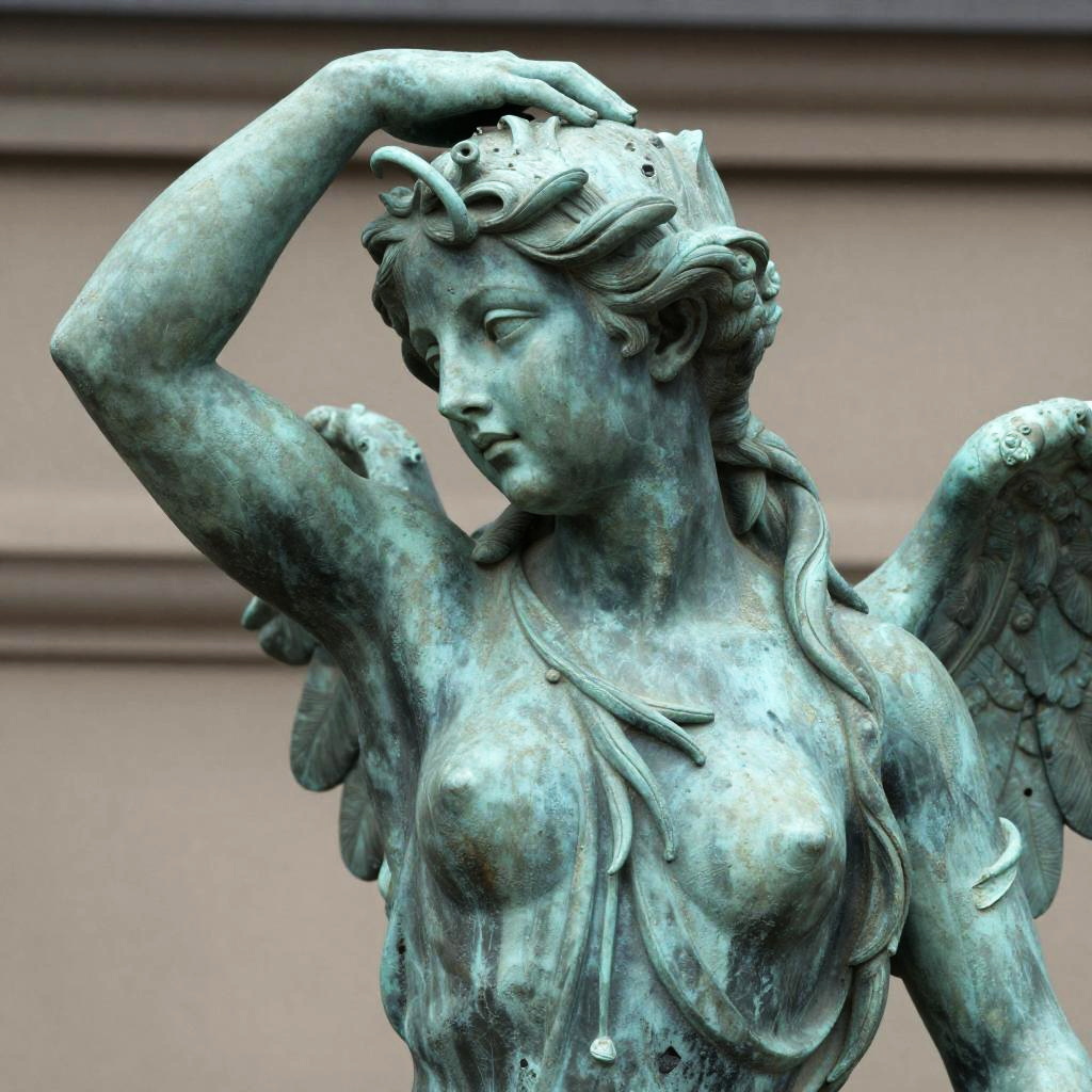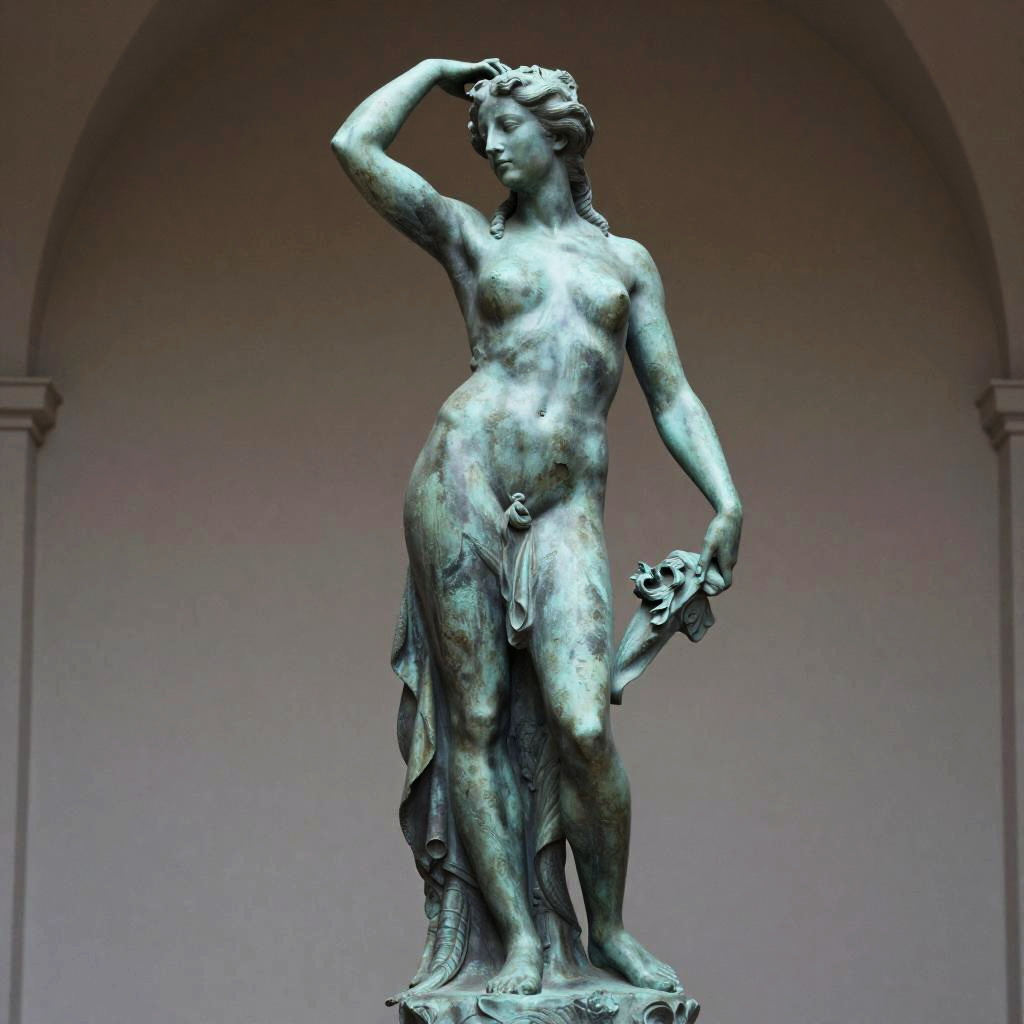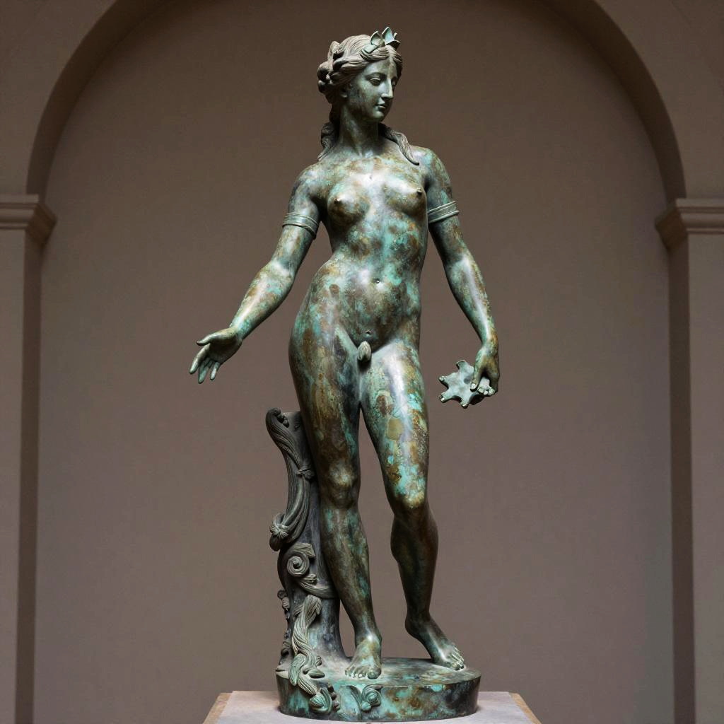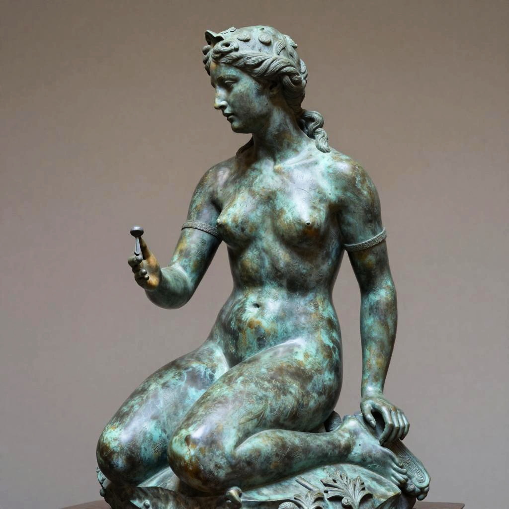 Detailed photo of an old bronze patina statue of captivating siren, full body portrait, various sensuous poses, photorealism, intricate detail, museum diffuse lighting