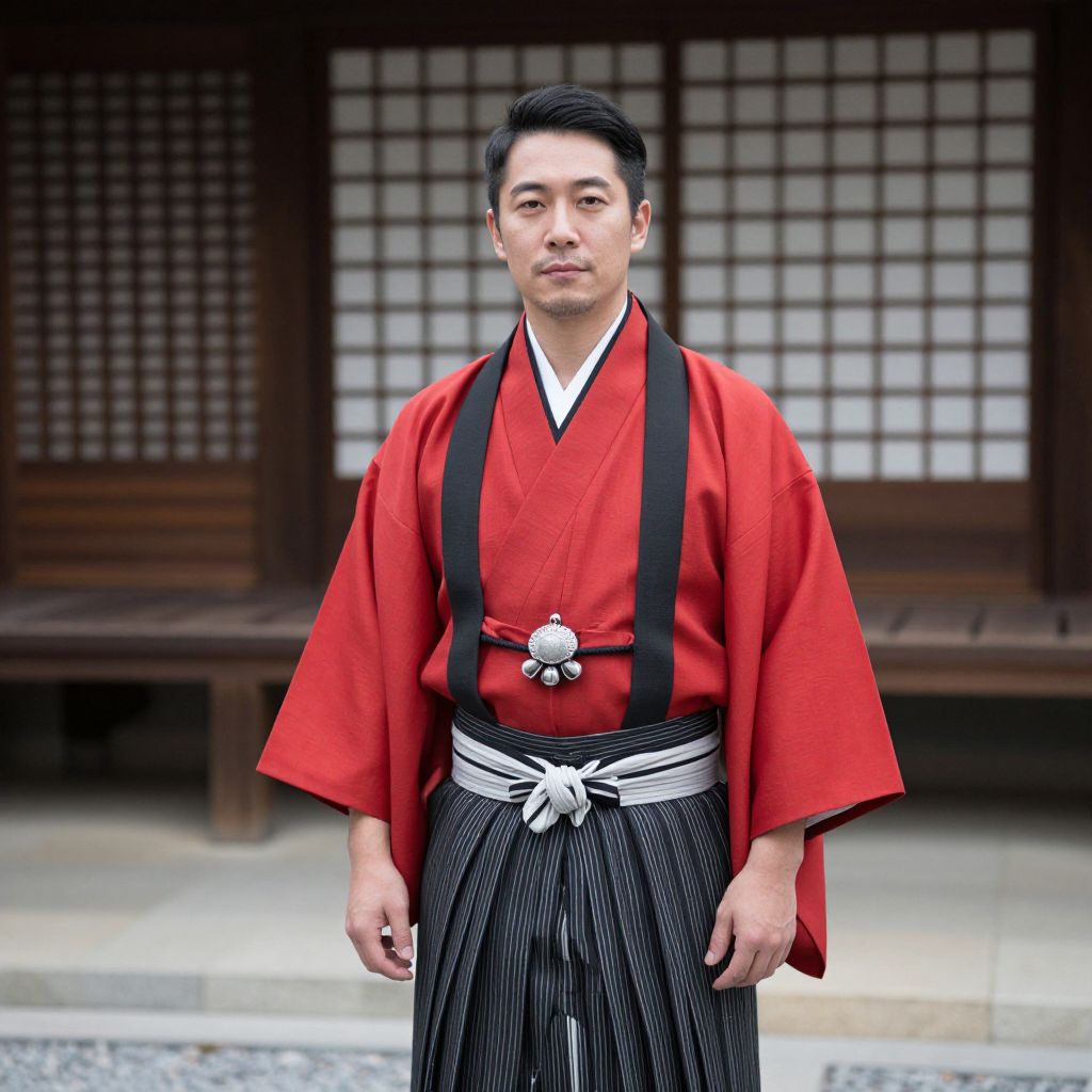 Photograph of an East Asian man in traditional red kimono with black pinstripes, white obi, and black suspenders, standing in