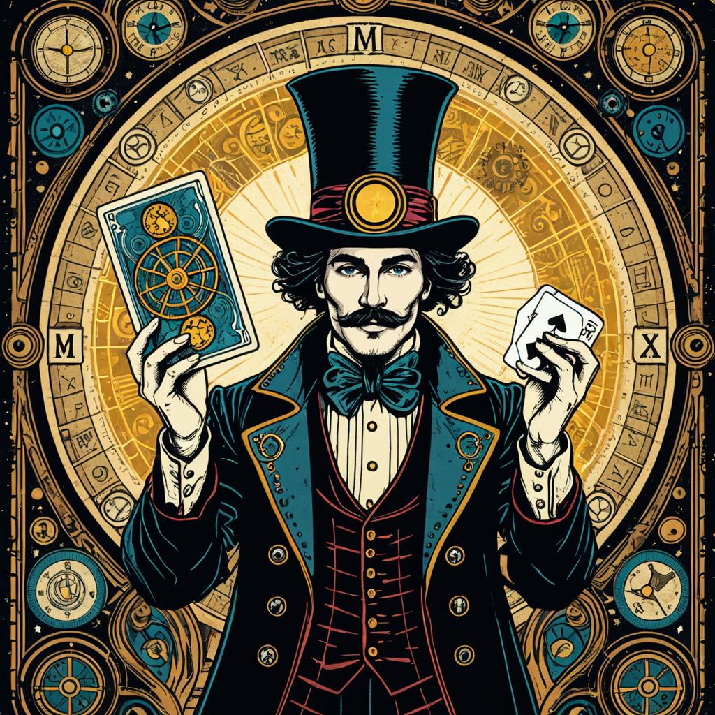 (psychedelic steampunk art style), depiction of The Magician Tarot card