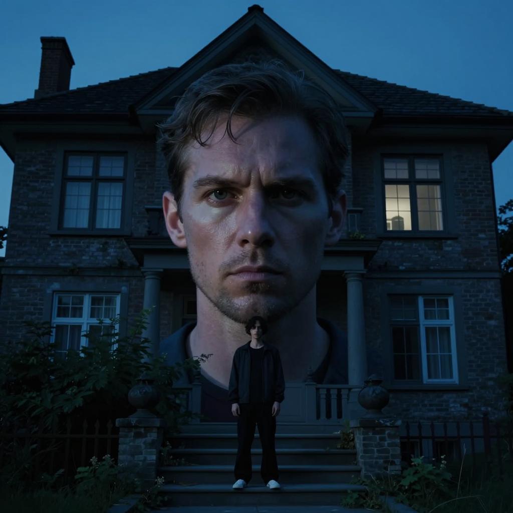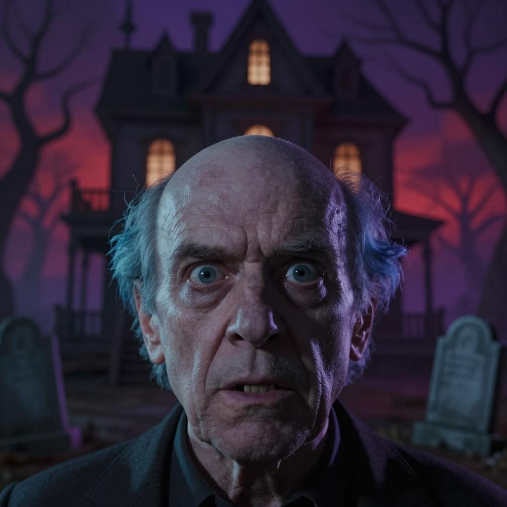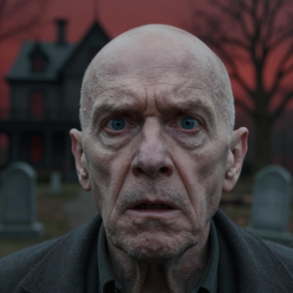 Close-up of an old man with a bald head, pale skin, blue eyes, and exaggerated facial expression of fear. Background includes a dark, eerie mansion with a red sky, barren trees, and a gravestone. The man's face dominates the foreground.
