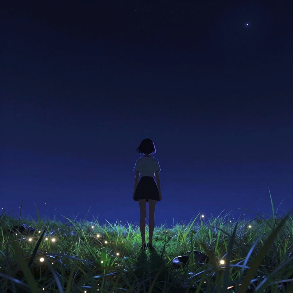 This digital artwork depicts a silhouette of a young girl with short dark hair, wearing a white shirt and a dark skirt, standing in a field of tall grass illuminated by small, glowing fireflies. The deep blue, starlit night sky forms the background, with one star visible in the upper right corner. The field is bathed in a mystical blue light, highlighting the grass and fireflies. The girl's silhouette is centered, facing away from the viewer, adding a sense of solitude and introspection. The overall mood is serene and magical, with a subtle, ethereal glow.