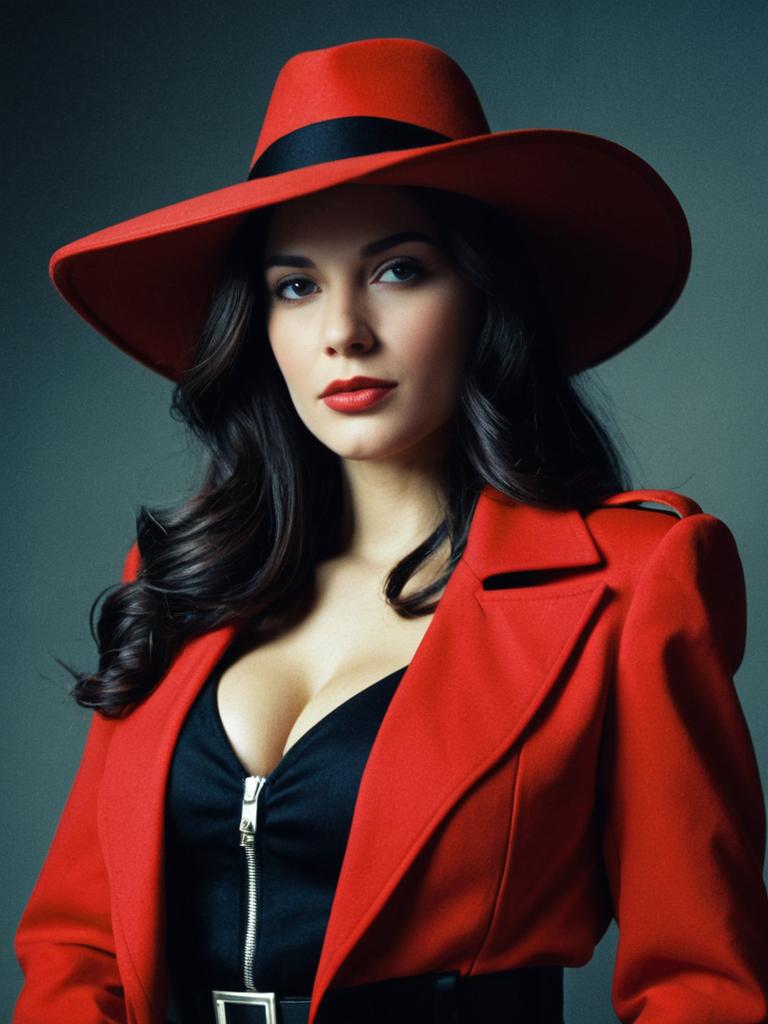 Editorial portrait of a woman wearing a vibrant red Carmen Sandiego-inspired outfit, featuring a wide-brimmed red hat with a black band and a matching red double-breasted coat with black buttons and a black belt. The woman has long, dark hair styled in loose waves and wears red lipstick, set against a neutral dark background.