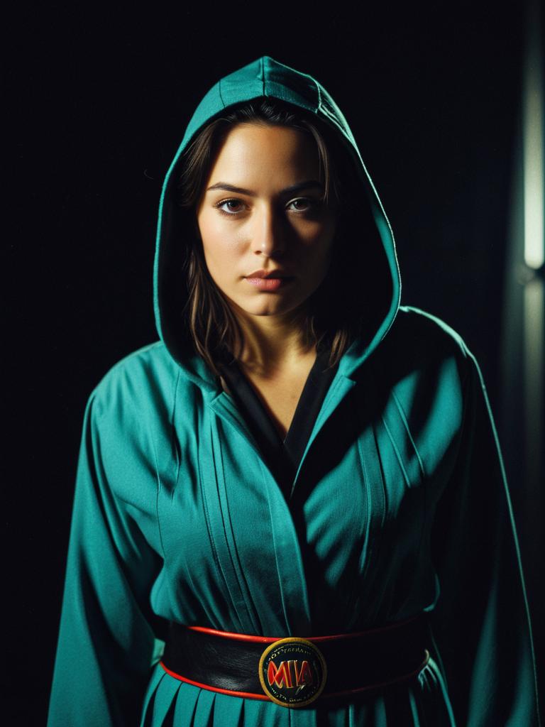 Woman in Carmen Sandiego costume, waist-up editorial portrait, photorealistic tones