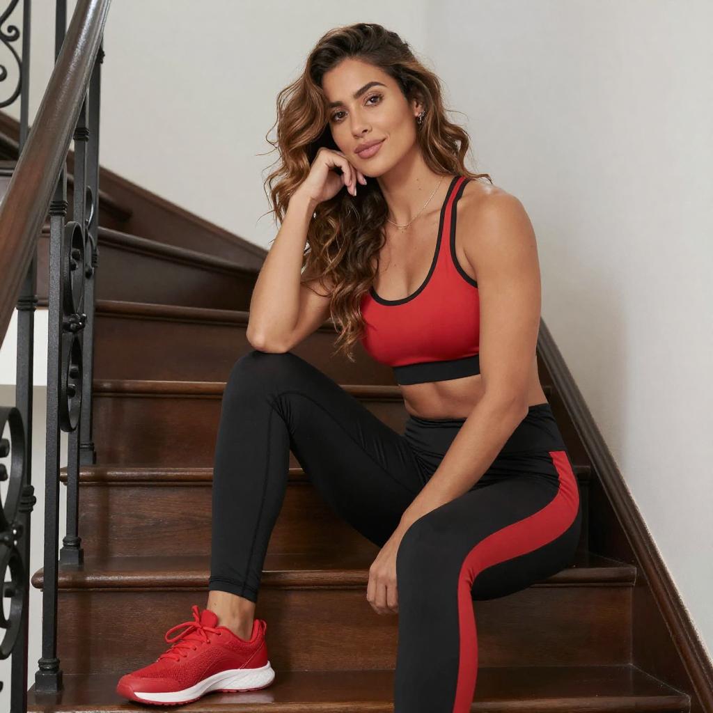 Photograph of a young woman with long black hair, tan skin, and a slim, athletic build, sitting on a gray brick sidewalk. She wears a gray sports bra, sheer gray leggings, and white sneakers, holding a bright yellow green apple. A black Reebok bag with blue is beside her. She smiles, leaning against a modern building with large windows.