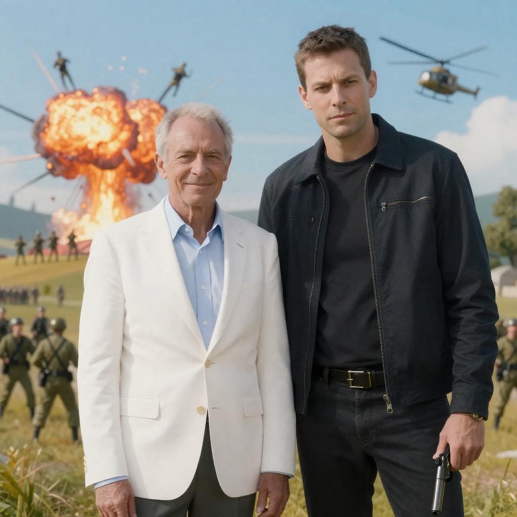 Photograph of two men standing close together outdoors. The smaller man wears a white blazer and light blue shirt, smiling gently. The taller man wears a black jacket and black shirt, holding a handgun with a serious expression. In the background, a cartoon-style explosion erupts with soldiers, a helicopter, and a crowd against a blue sky with scattered clouds and rolling yellow-green hills.