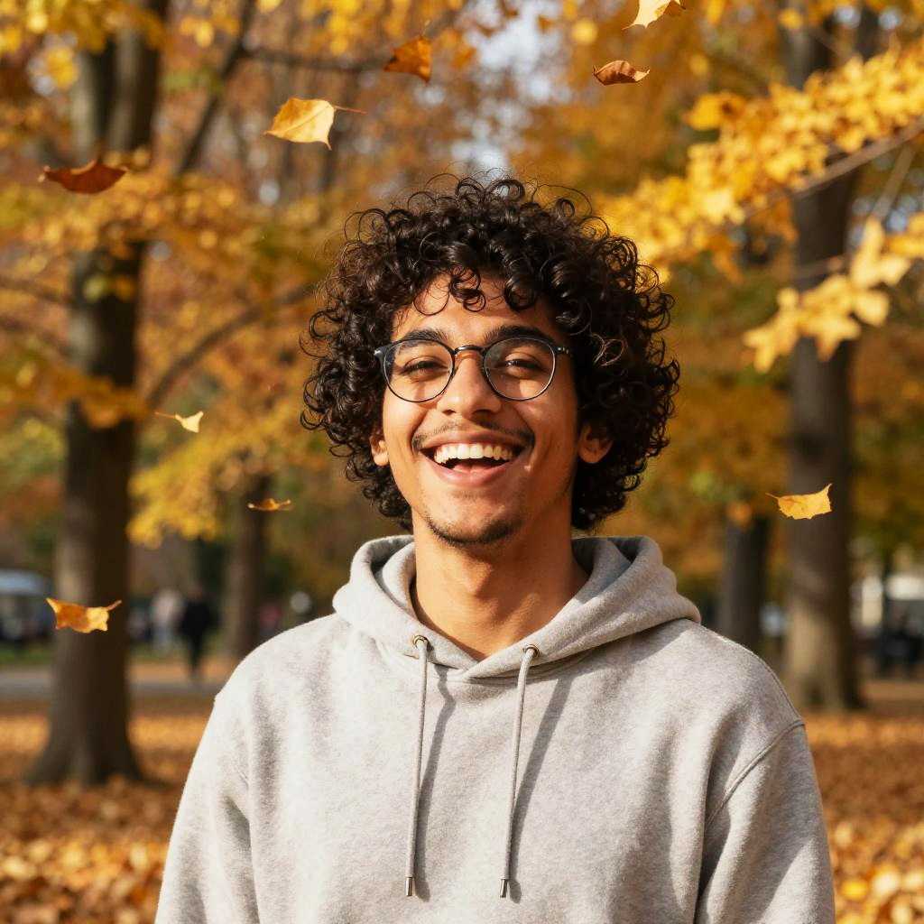 Photograph of a smiling young man with curly black hair, glasses, and a gray hoodie, standing in an autumn park with falling yellow leaves.