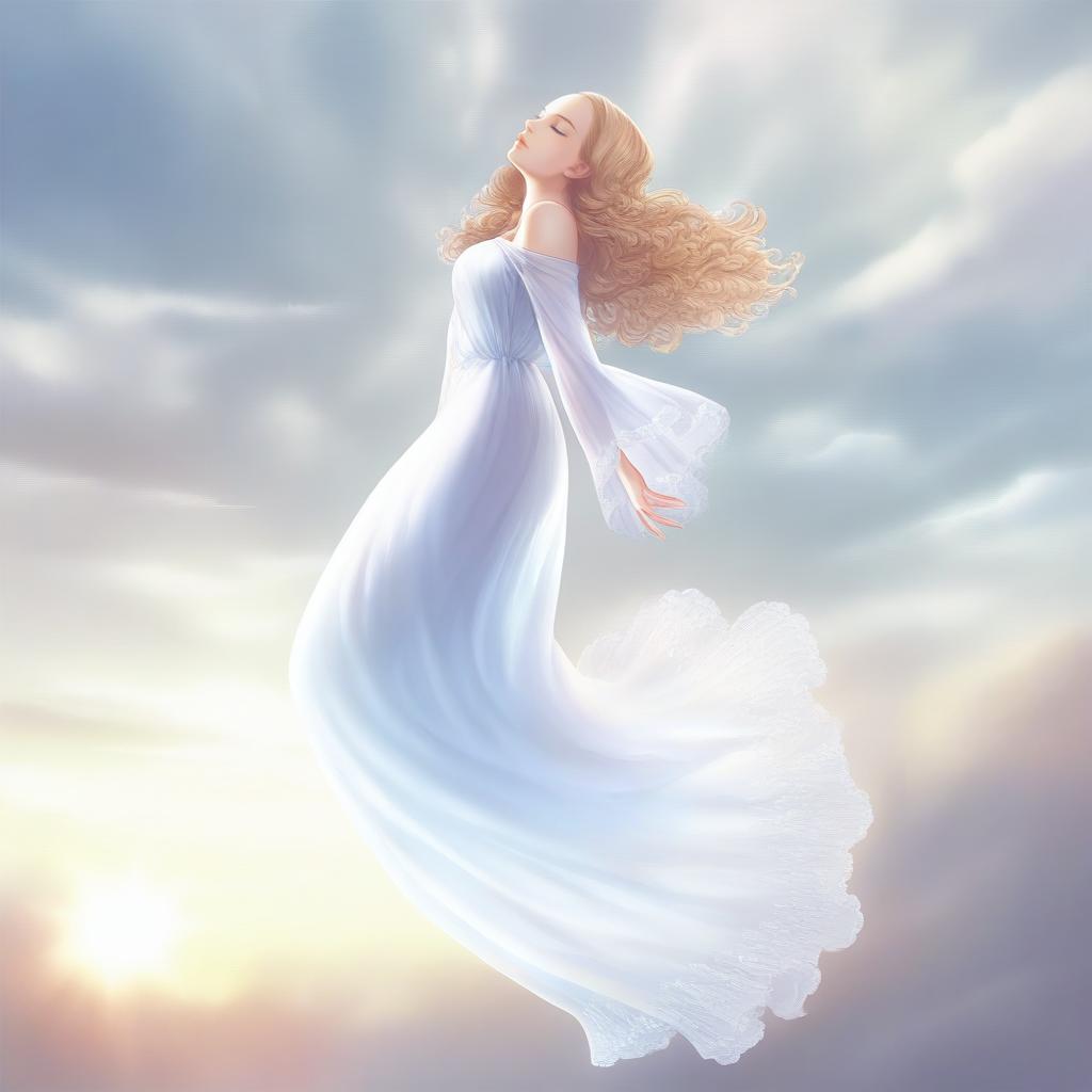 1girl, solo, blonde hair, dress, cloud, sky, long hair, sun, closed eyes, white dress, see-through, blue dress, long sleeves, breasts, bare shoulders, long dress, blue eyes, cloudy sky, floating, sunlight, lips, full body, curly hair