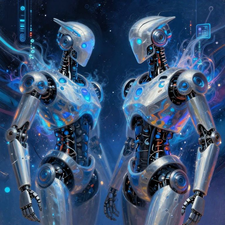 AI art style prompts showcasing surreal robots painting abstract masterpieces, dynamic brush strokes infused with electric blues and metallic silvers, set against a cosmic background dotted with glowing data streams and holographic elements that pulse with energy.