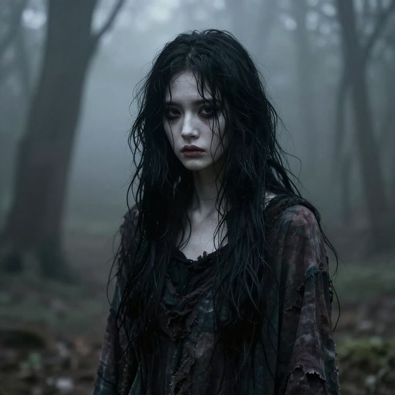Ugly girl with black hair standing in a foggy forest, haunting and eerie atmosphere, pale skin contrasted with jet black tangled hair, worn-out clothing, muted color palette, surreal and gothic style, detailed expression of melancholy and isolation.