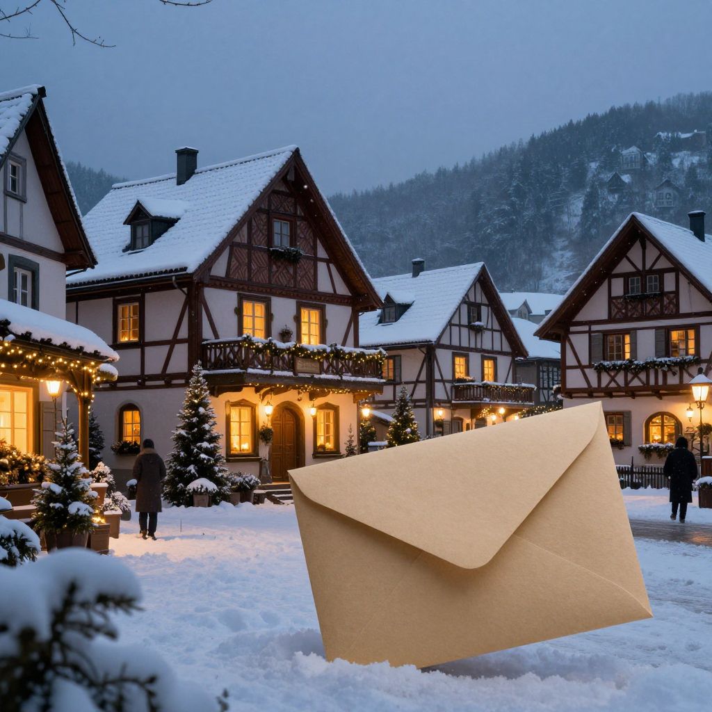 Photograph of a snowy, alpine village with half-timbered houses, illuminated windows, and a large, open, beige envelope in the