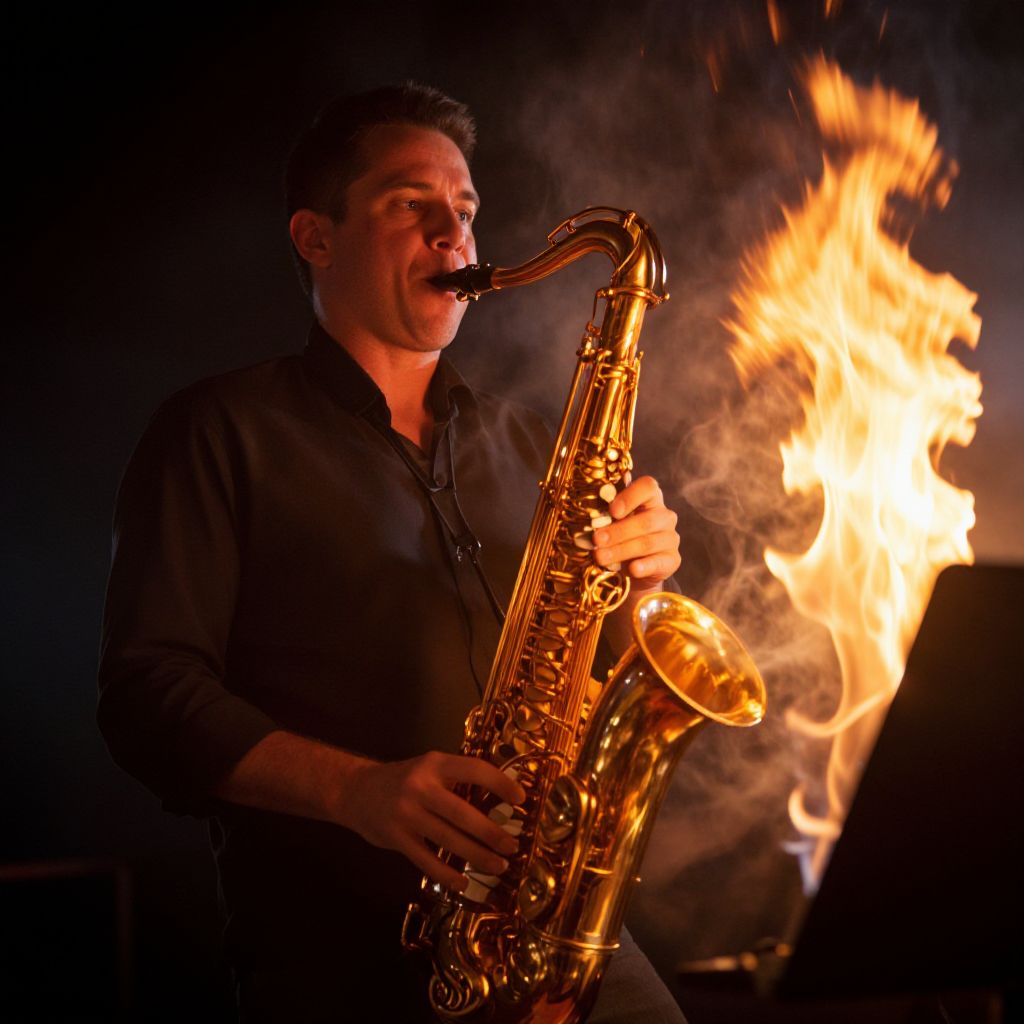 Vivid, high contrast photograph, dramatic lighting, man playing saxophone amidst swirling flames, fiery tendrils dancing to the rhythm, intense emotions, captivating scene, smoke-filled environment, deep shadows, golden highlights, moody atmosphere, striking composition, blurred motion effect, 8K resolution. Man has masculine face and piercing eyes