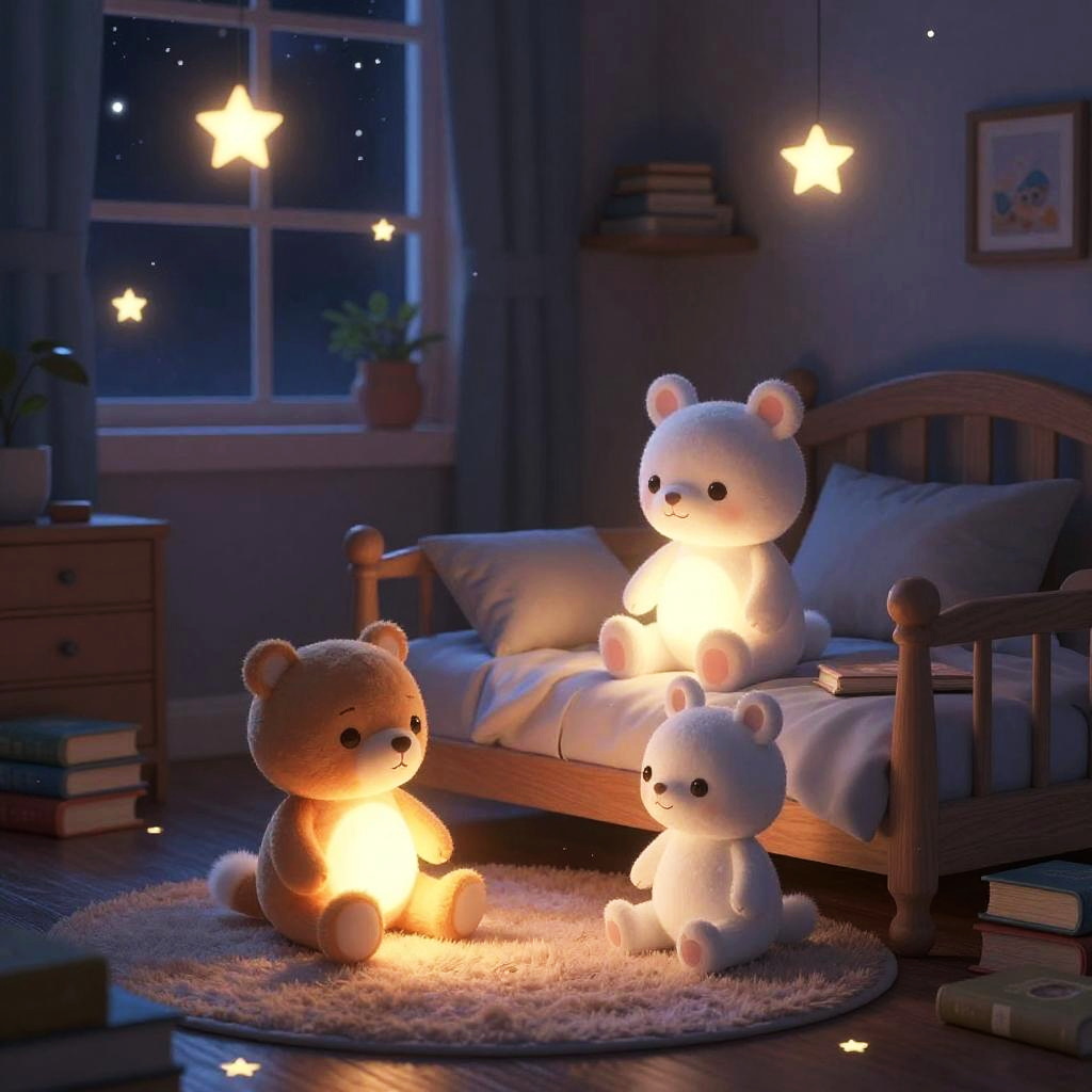 AI illustrations for children's books depicting a cozy nighttime scene where AI-powered toys come to life, glowing softly in a child's bedroom filled with books and stars, gentle warm lighting, and a dreamy, comforting storybook aesthetic.