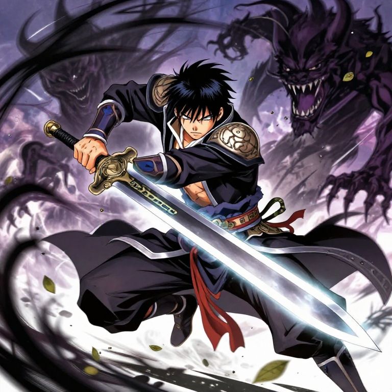 Manhwa cultivator wielding a glowing sword in a fierce battle against shadowy beasts, dynamic action pose, swirling wind and scattered leaves, intricate armor with ancient symbols, cinematic lighting and high contrast, vivid color scheme drawing from manhwa aesthetics.