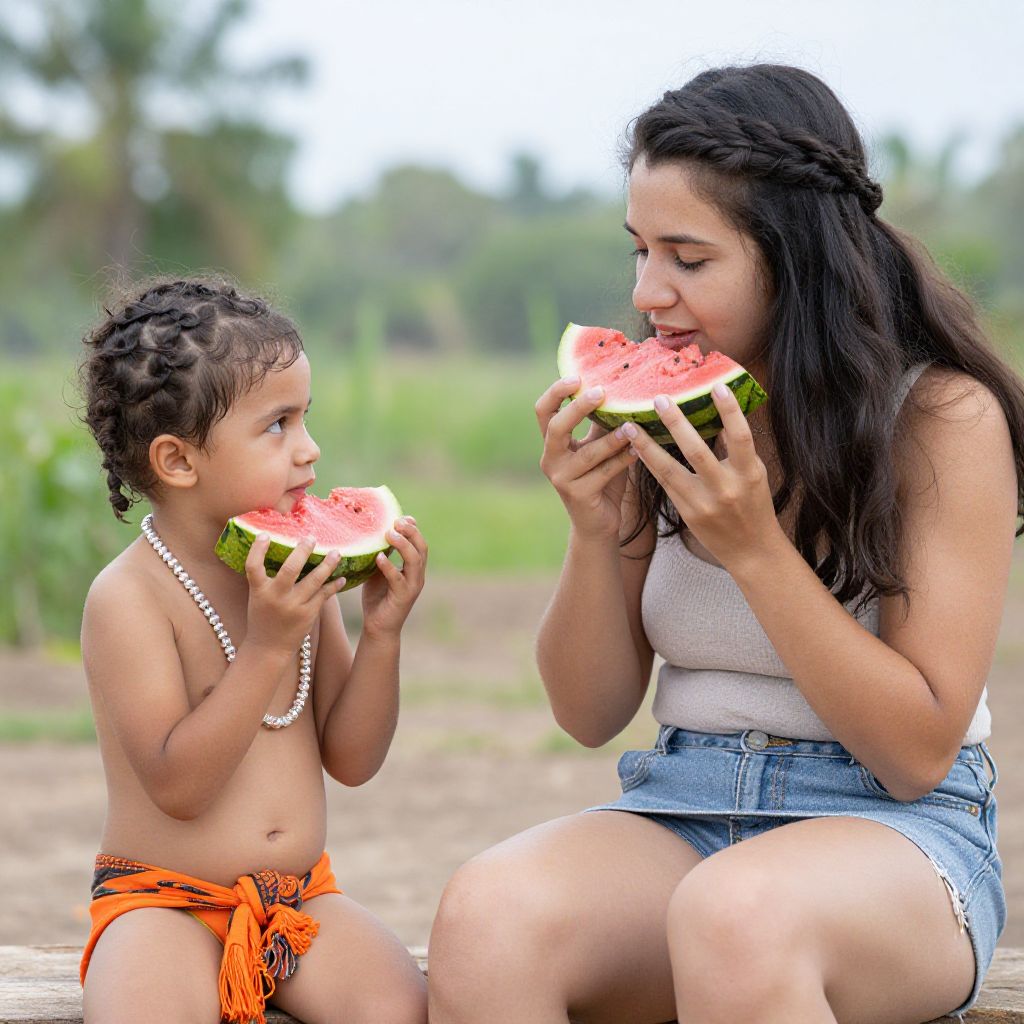 Photograph of a young Latina woman with long, dark, braided hair and a medium build, wearing a white tank top and blue denim shorts, sitting on the ground. She is sharing watermelon slices with a small, shirtless Latina child with curly hair, wearing an orange sarong and a white beaded necklace. Both are holding watermelon pieces and looking at each other. The background is blurred, showing greenery and a tree, indicating an outdoor setting. The image captures a moment of shared joy and connection.