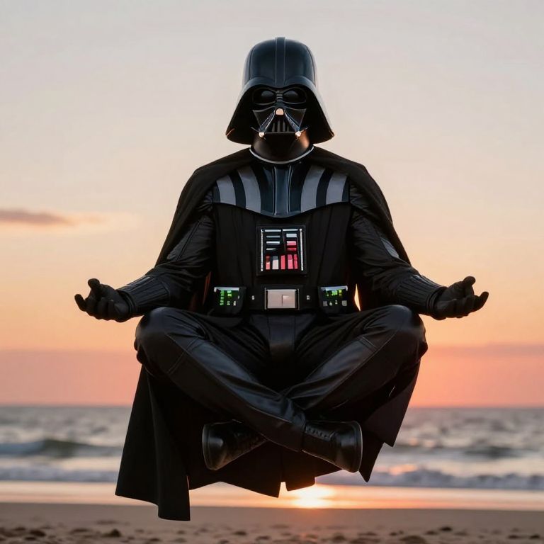 Silk Spectre darth Vader floating in a meditation pose with a sunset beach background. Cinematic realism. Ray tracing.,