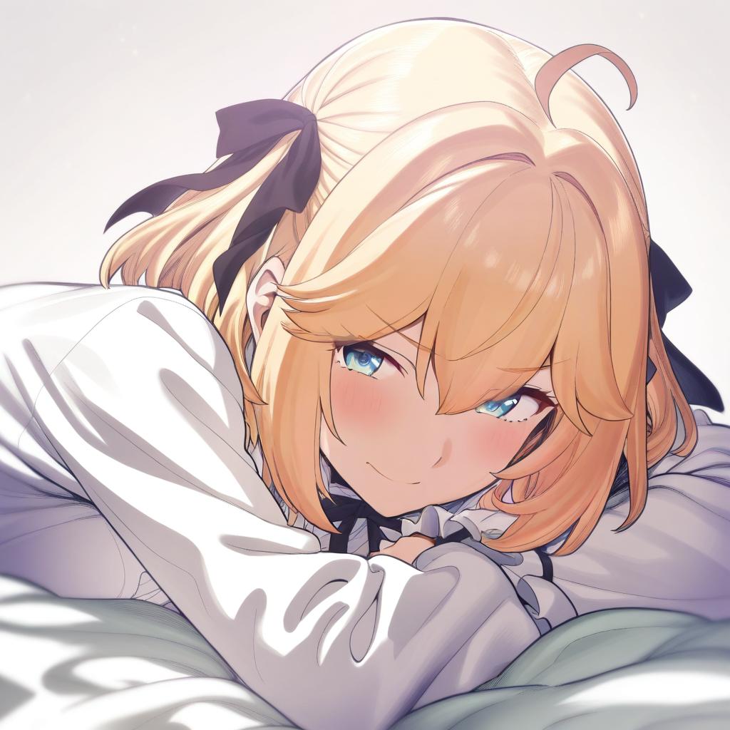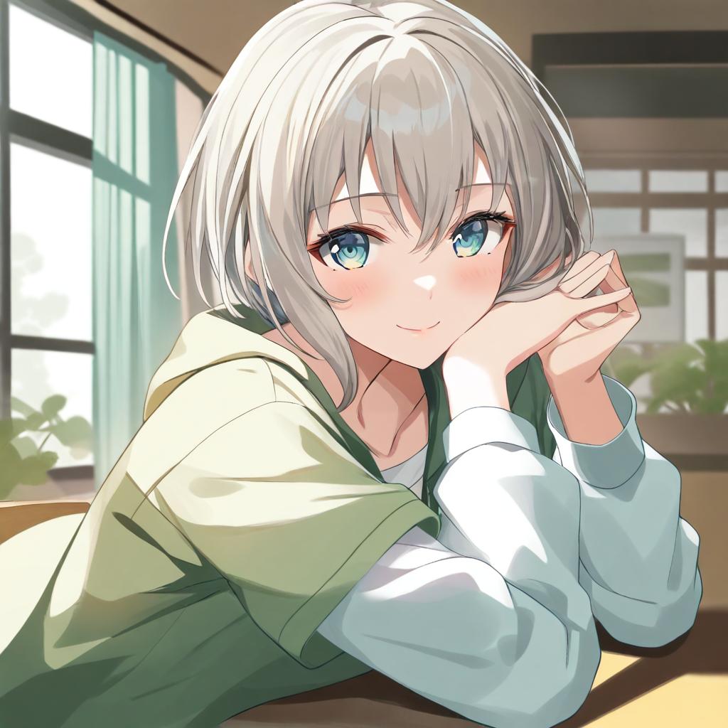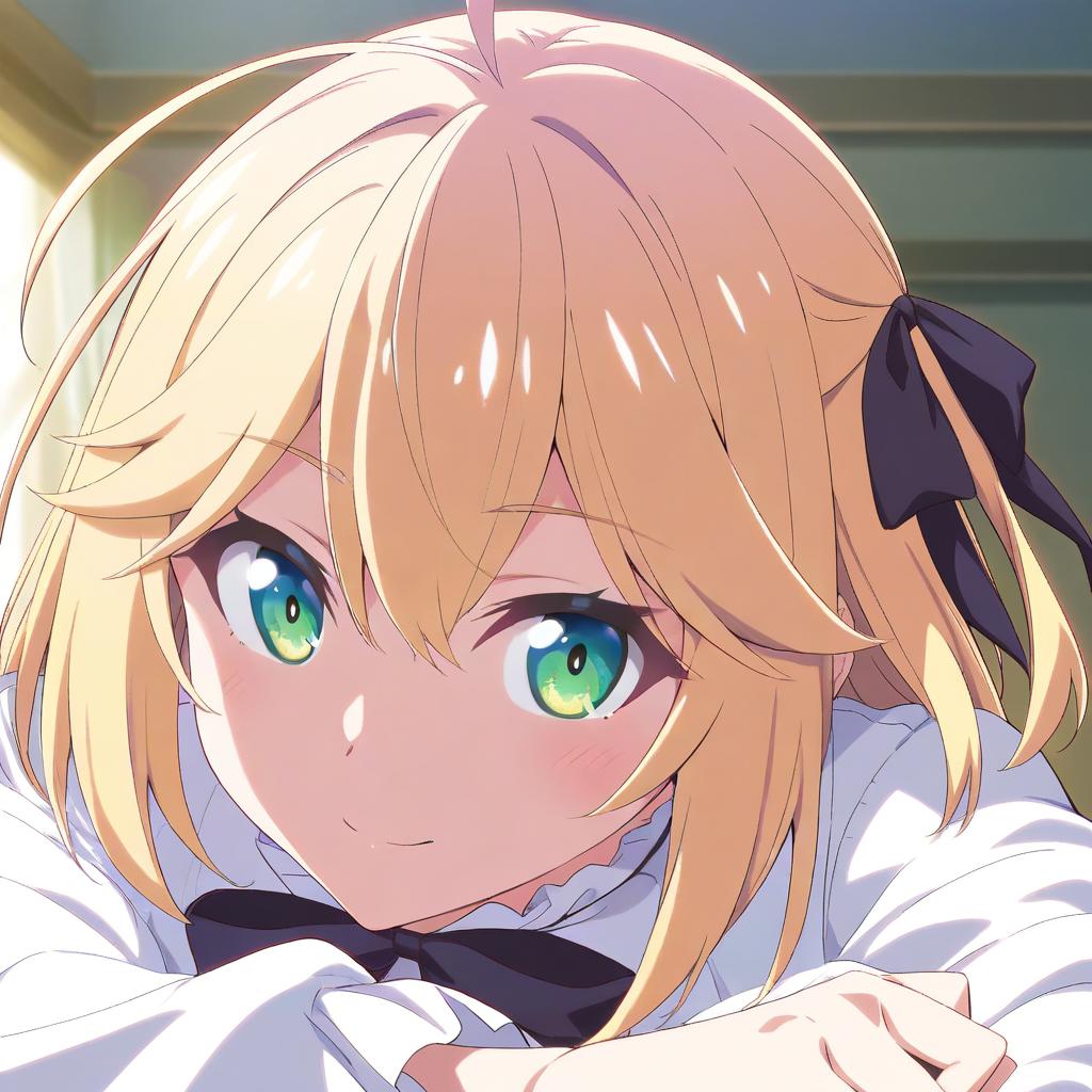Illustration of a dark-skinned anime male character with short blonde hair and vivid blue eyes, wearing a white long-sleeve collared shirt. Character is leaning forward with a relaxed smile, against a simple muted background. Inspired by anime aesthetics.