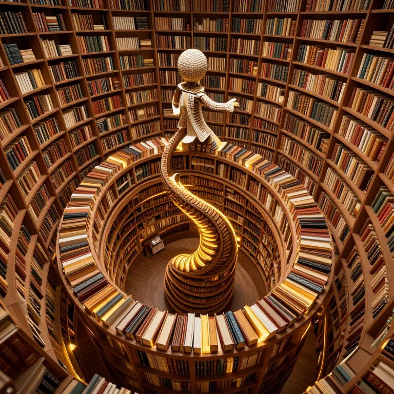 In a mesmerizing 3D-rendered library spiraling into infinity as a Möbius strip, a serpentine figure crafted entirely from books gracefully winds through the shelves, casting a golden glow that highlights its intricate details and evokes a sense of timeless storytelling.