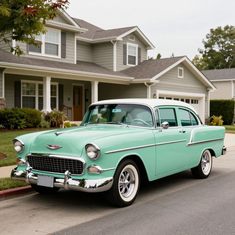 Classic 1955 Chevrolet 210 parked gracefully in front of a suburban home, showcasing its mint-green exterior, chrome accents, and vintage charm against a backdrop of manicured landscaping and a two-story house.