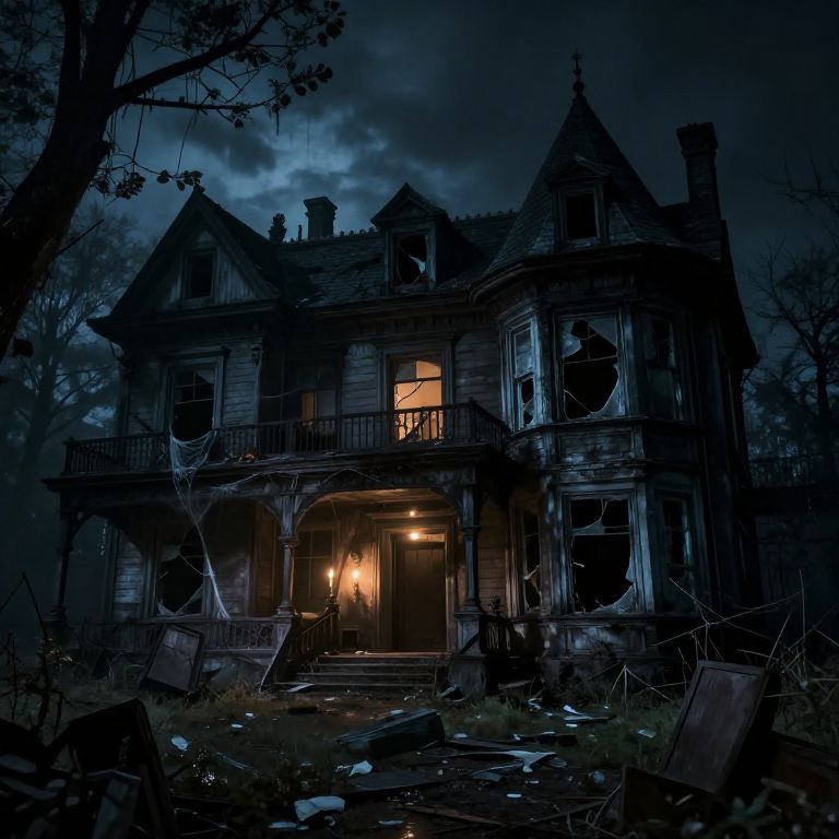 Dark and eerie abandoned mansion on a stormy night, broken windows, shattered furniture scattered, dim candlelight flickering inside, cobwebs hanging from ceiling, spectral figures subtly visible in the shadows, haunting and suspenseful ambiance.