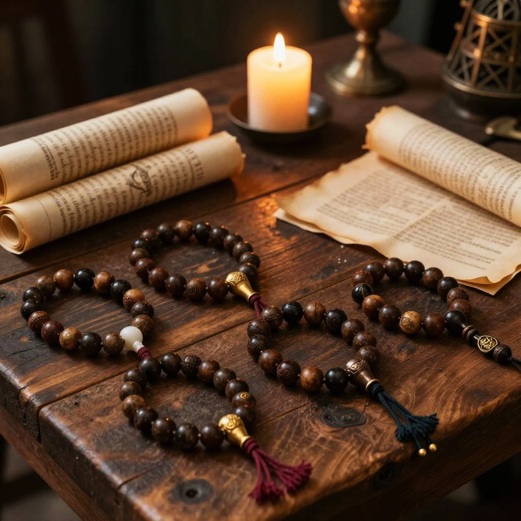 Close-up of prayer bead 5e, intricately carved wooden beads strung on a leather cord, glowing faintly with magical energy, resting on a wizard's spellbook, fantasy art style