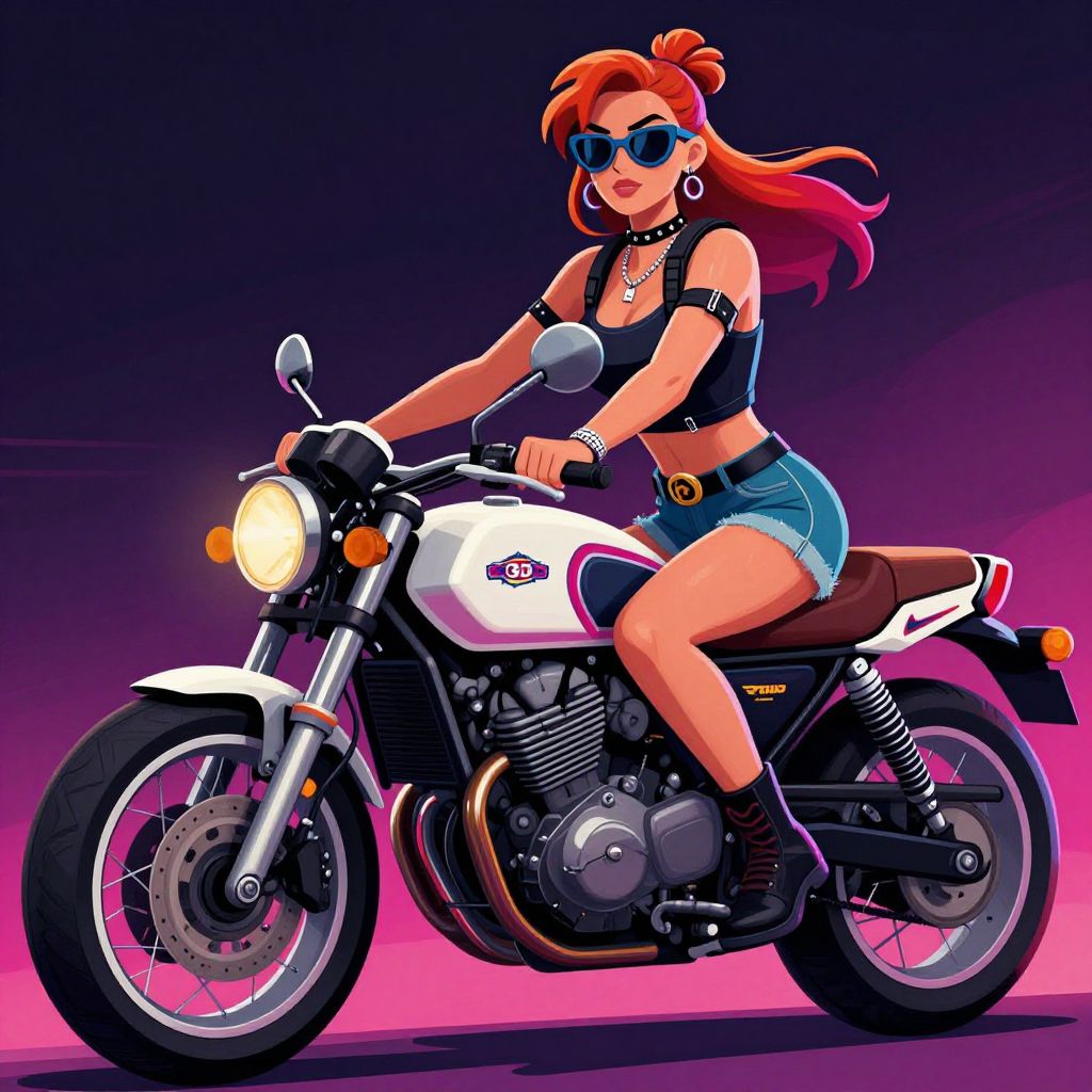 A high-definition digital illustration captures a confident woman riding a classic motorbike, featuring bold lighting effects and a retro aesthetic, with her stylish attire and accessories accentuating the cyberpunk-inspired vibe.