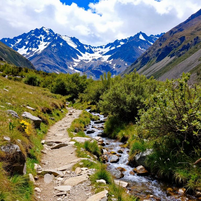 Photograph of a mountainous landscape featuring a rocky, dirt path winding through a lush, green valley with a small, clear stream flowing alongside it. Dense shrubs and grasses border the path, while tall, rugged mountains with patches of snow loom in the background. The sky is partly cloudy with bright blue and white hues. The path is uneven, with scattered rocks and pebbles, and the stream reflects the sunlight. The image captures the natural beauty and ruggedness of the alpine environment.