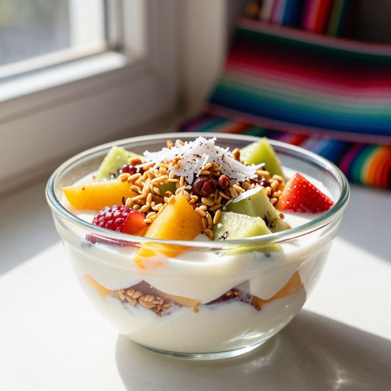Bionico dessert styled in a clear glass bowl, showing the layers of fresh chopped fruits soaked in cream and sprinkled with granola and coconut, with soft morning light streaming through a window and a colorful Mexican textile as the backdrop.