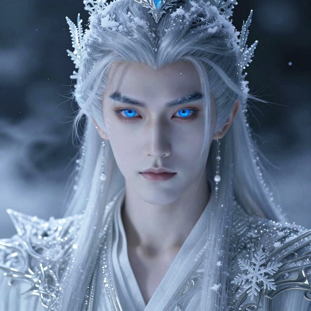 Fantasy character with porcelain pale skin, silver hair and icy blue eyes, surrounded by frosty mist and snowflakes, intricate details, mystical aura, high resolution digital art
