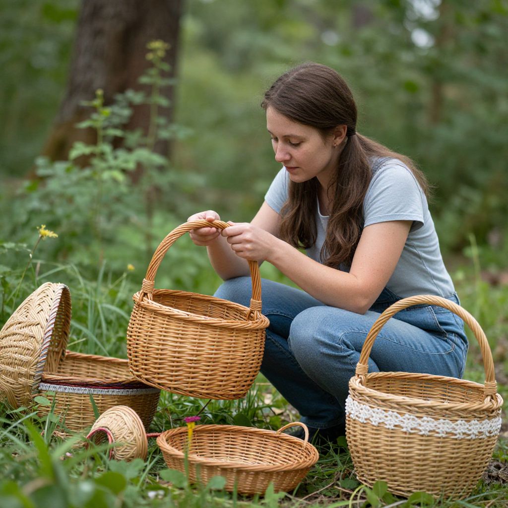 Woman inspecting handmade wicker baskets outdoors, surrounded by natural greenery and additional woven items, showcasing traditional craftsmanship in a serene forest setting.