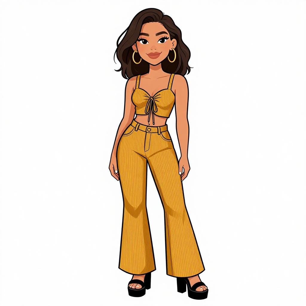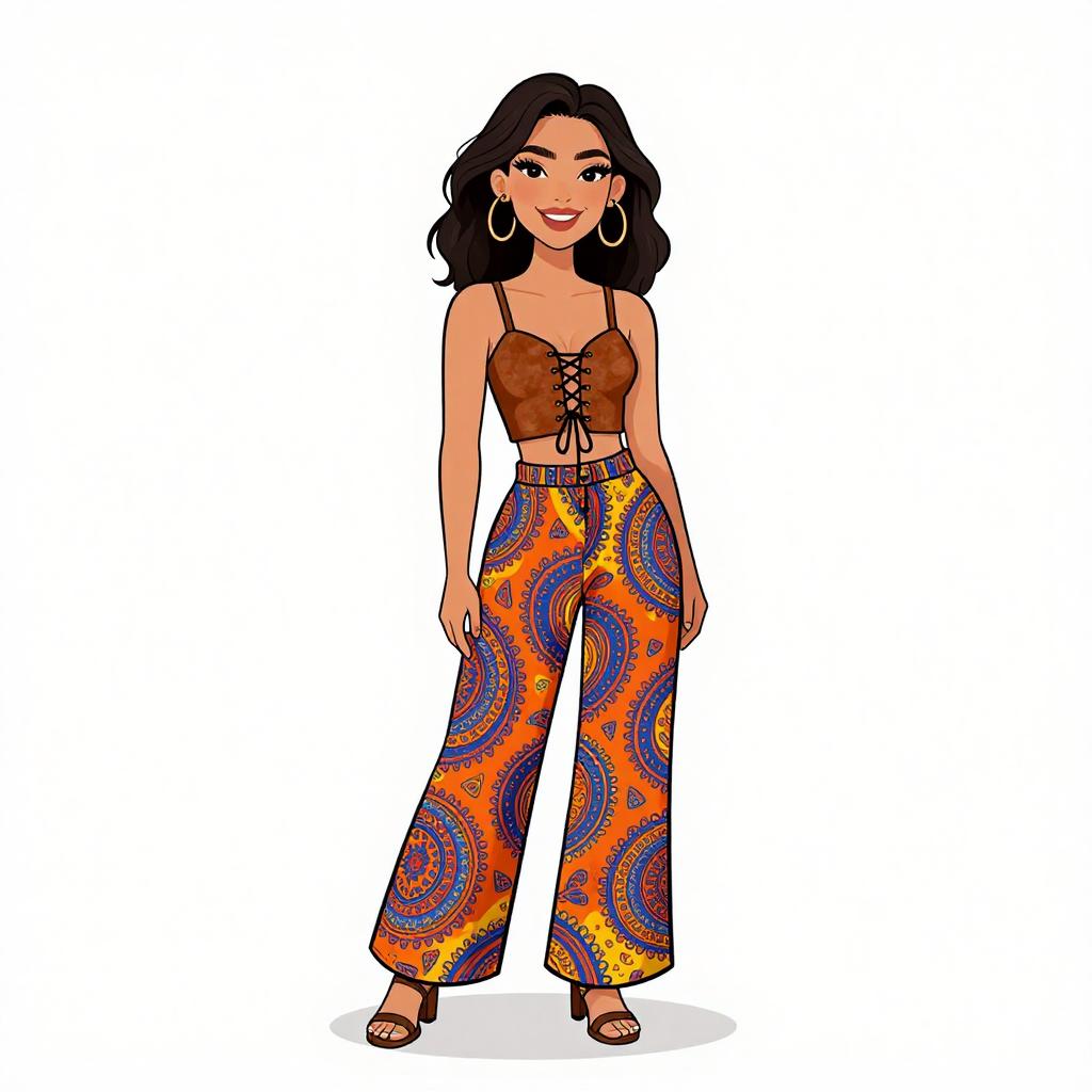 Woman with pretty face and pretty hair. smiling Woman, bohemian, brown suede crop top with criss-cross lace-up front, spaghetti straps, paired with loose fitting, high-waisted pants in a vibrant and eclectic paisley print featuring bold colors like orange, blue, and yellow, the pants have a wide leg design. --sref 1467
