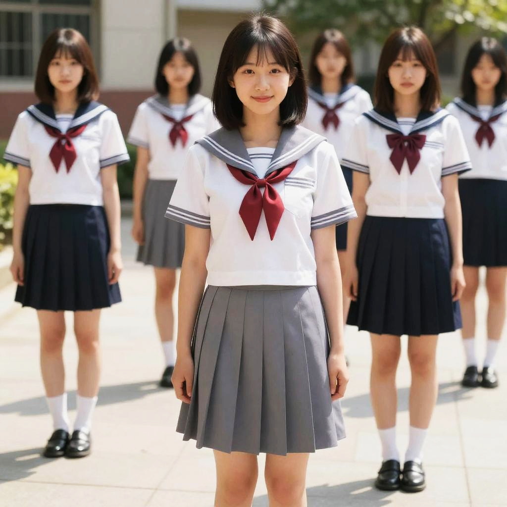 Taiwanese school uniform, a group of students standing in a sunny courtyard, detailed traditional attire with sailor collars and pleated skirts, soft pastel colors, realistic style