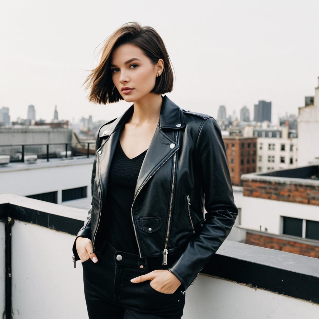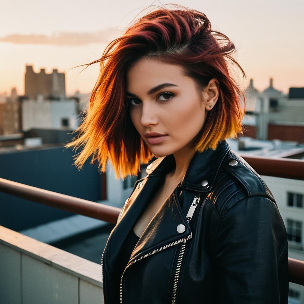 Fashion Model with Midnight Blue Hair on Rooftop at Night