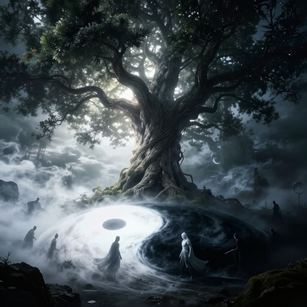 (mystical landscape, world tree, epic battle, yin and yang, light and dark, Forces of Good versus Evil), dramatic lighting, high resolution, 4k, HDR, (ethereal atmosphere, intense contrast), fantasy art style, concept art, epic composition, dramatic angle, cinematic lens, wide angle