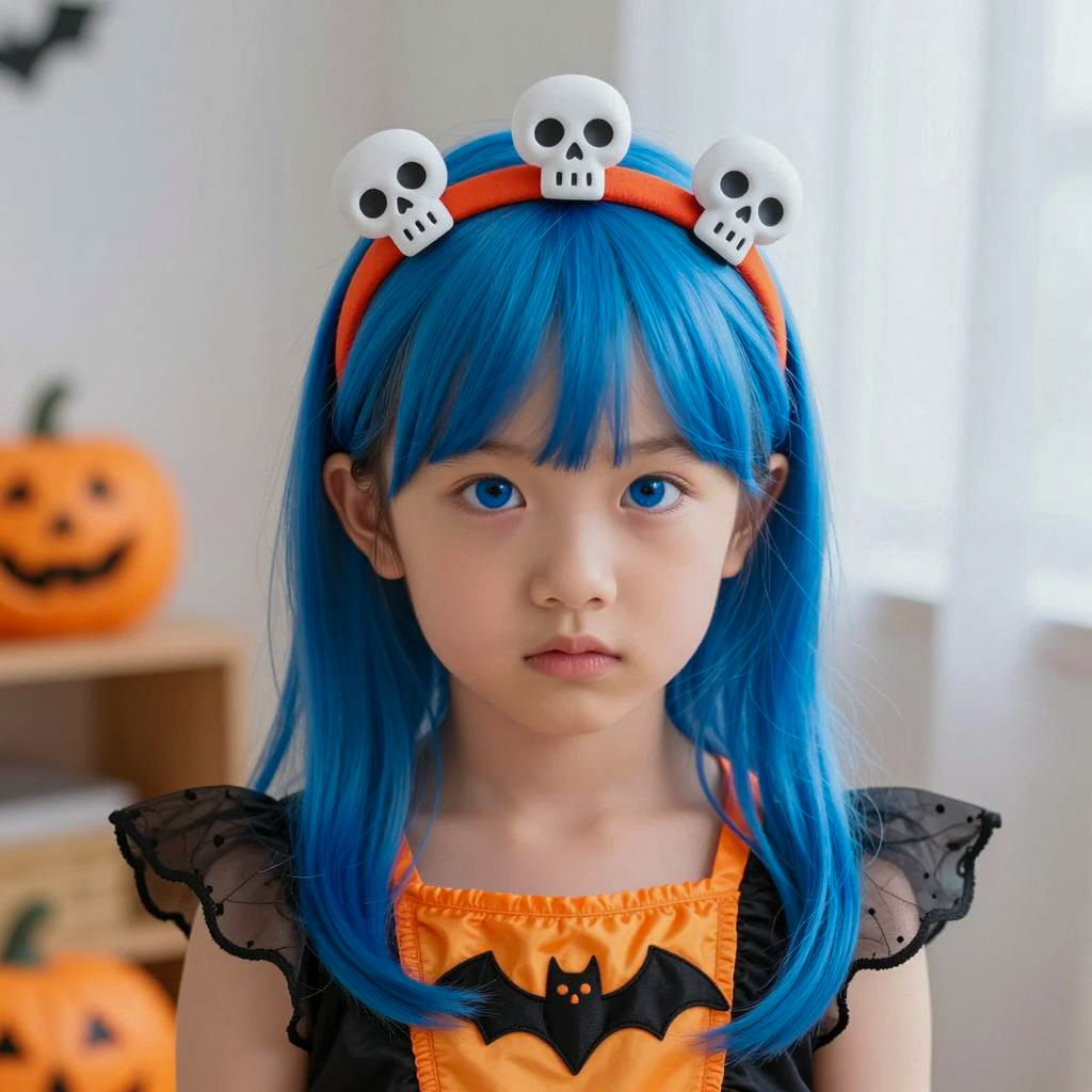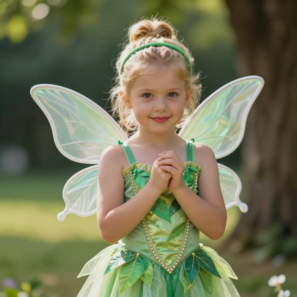Girl halloween costume fairy, photograph of a young girl, fairy costume, orange and black dress, orange puffed sleeves, black skirt, white lace headband with orange bow, translucent butterfly wings, brown hair in side braid, green eyes, neutral expression, sunlight, blurry forest background, daytime, soft lighting, cute, child-friendly, whimsical, child standing, front view, realistic, detailed, warm colors, outdoor setting