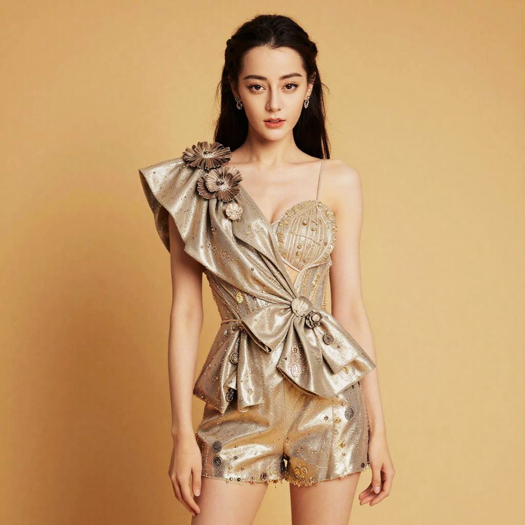 Photograph of a beautiful woman with long, dark hair standing against a gold, hexagonal-patterned background. She's wearing a shimmering, gold sequin dress that hugs her curves, with thin straps. Her makeup is bold, with dark eyes and red lipstick. She's accessorized with gold earrings. The lighting highlights the sequins, making them sparkle. The overall look is glamorous and stylish.