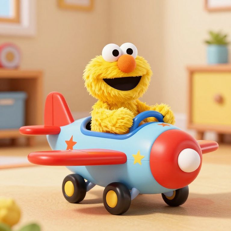 A vibrant 3D-rendered illustration featuring a cheerful yellow character from Sesame Street, piloting a colorful toy airplane with star decals, set against a cozy indoor backdrop with warm lighting and playful decor, evoking the nostalgic charm of Fisher Price Little People toys.