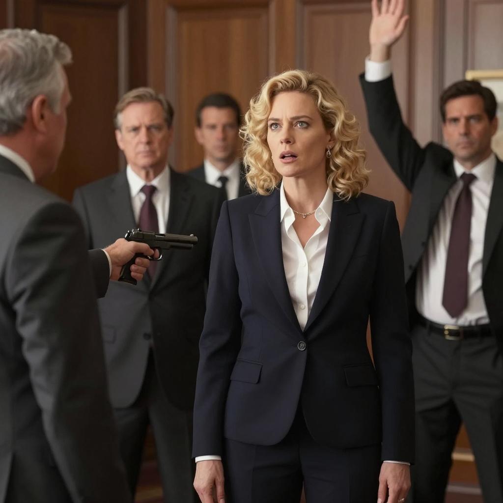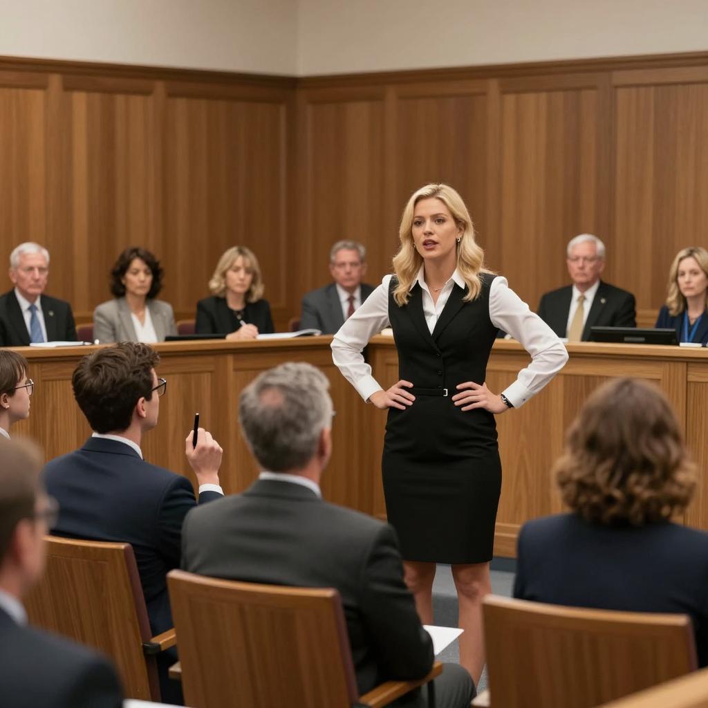 Blonde woman dressed in a black dress and white shirt stands confidently with hands on hips in a wood-paneled courtroom. Several jurors and spectators, both men and women in formal attire, sit attentively in wooden chairs. The setting includes traditional courtroom elements such as wooden paneling and rows of seating.