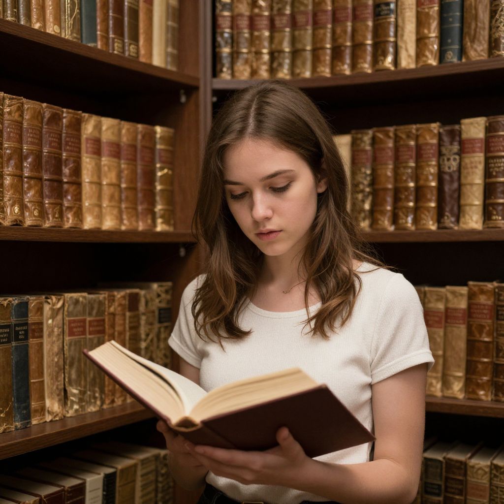 Photograph of a young Caucasian woman with fair skin and long brown hair, wearing a plain white short-sleeved shirt, standing in a library. She is focused on reading an open book held in both hands. The background features tall, dark wooden bookshelves filled with vintage, leather-bound books with gold and red embellishments. The lighting is soft, creating a warm, scholarly atmosphere. The woman's expression is calm and concentrated, with her eyes directed downward at the book. The image captures a moment of quiet study and intellectual curiosity.