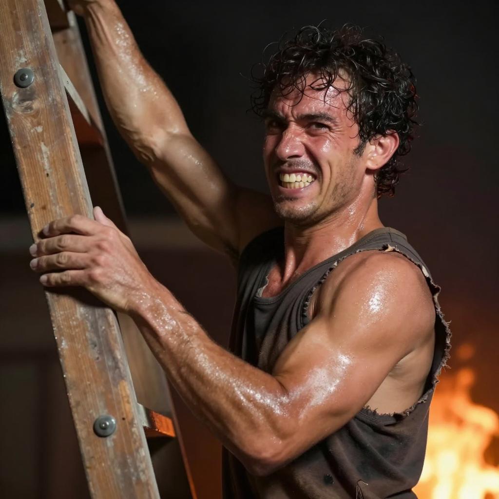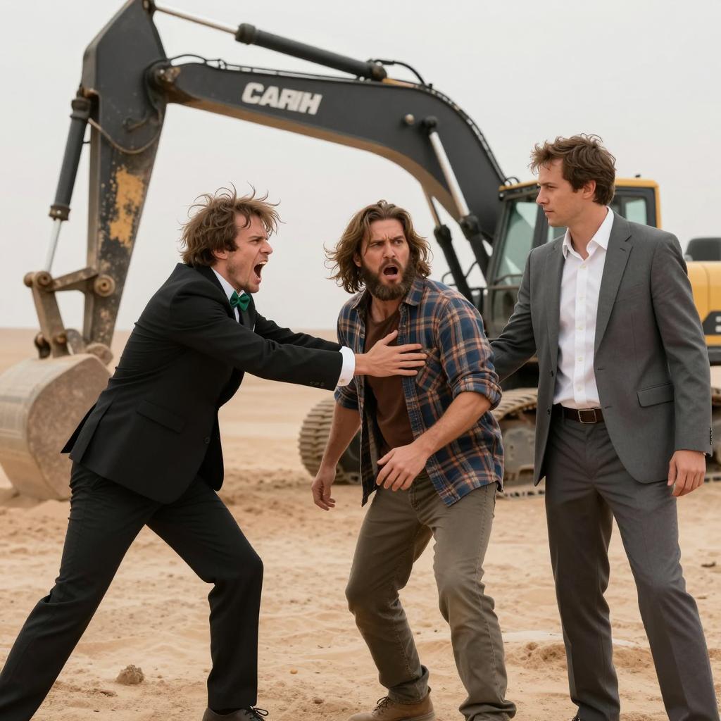 Photograph of a construction site. Foreground: dirty, shirtless man in blue shirt, brown pants, and gloves, sitting on metal beam, mouth open in yell. Background: three men in hard hats and yellow safety vests, standing on wooden structure. Crisscross wooden beams, metal sheeting, clear sky. Man in foreground has disheveled hair, visible dirt on face and clothes.