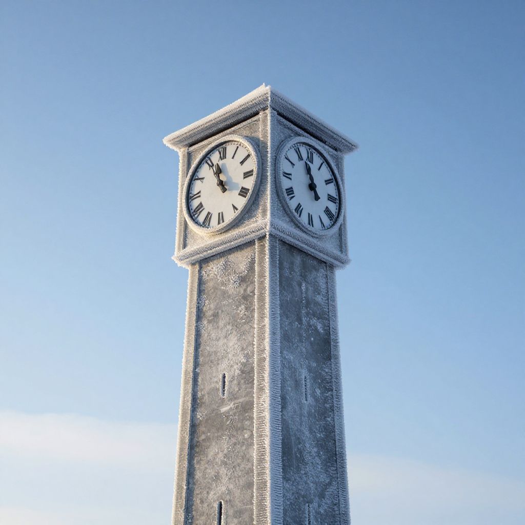 Frozen clock tower stands tall amidst a snowy landscape, its four faces encased in icy layers, each displaying Roman numerals and hands, while sunlight casts a serene glow over the scene.