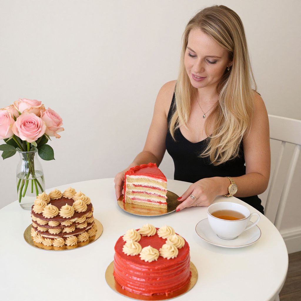 Blonde-haired woman seated at a white table in Zoe's Sweet Boutique Cafe, Redcliffe, elegantly arranging three layered cakes with red frosting and cream swirls, accompanied by a cup of tea and a vase of pink roses in the background.