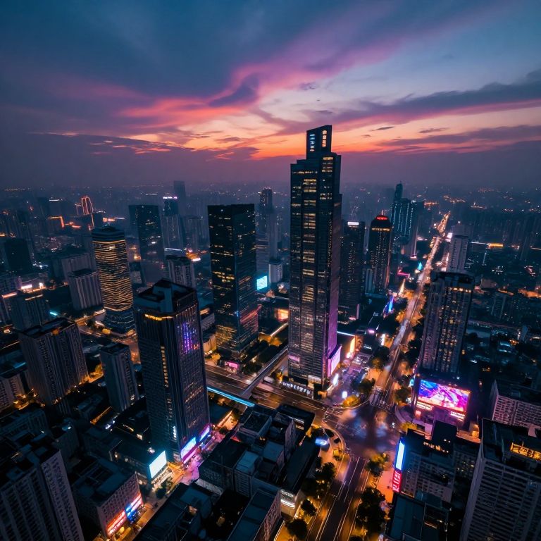 A surreal cityscape at twilight transitions from reality to fantasy, its skyscrapers softened by dreamlike haze as they stretch into the sky. From a bird's eye view, an intricate network of roads and bridges reveals itself, merging with the warm, glowing lights that illuminate the scene upon sunset. This unique fusion of urban and celestial elements evokes wonder and introspection, inviting viewers to explore the juxtaposition between familiar and fantastical landscapes in this captivating composition.