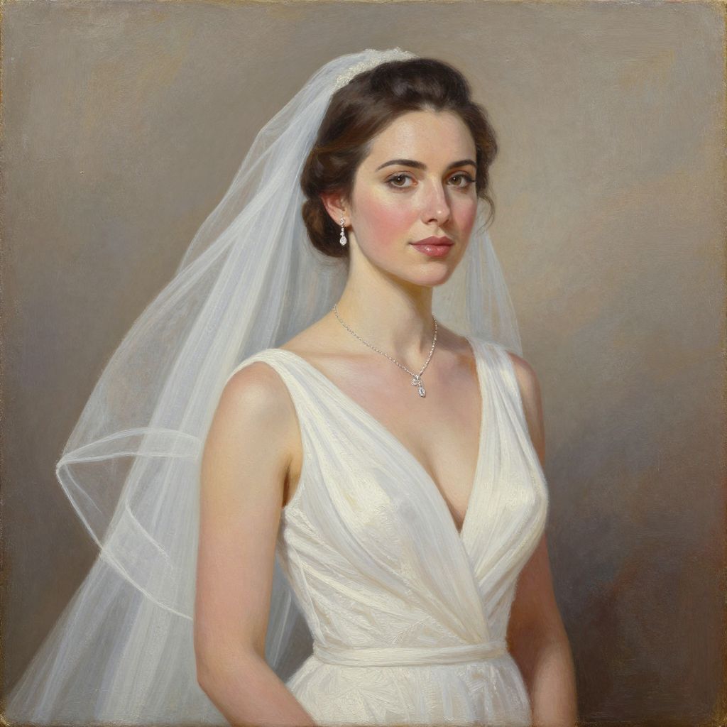Photorealistic painting of a beautiful bride with fair skin, dark hair in an updo, wearing a white, deep V-neck gown and veil,