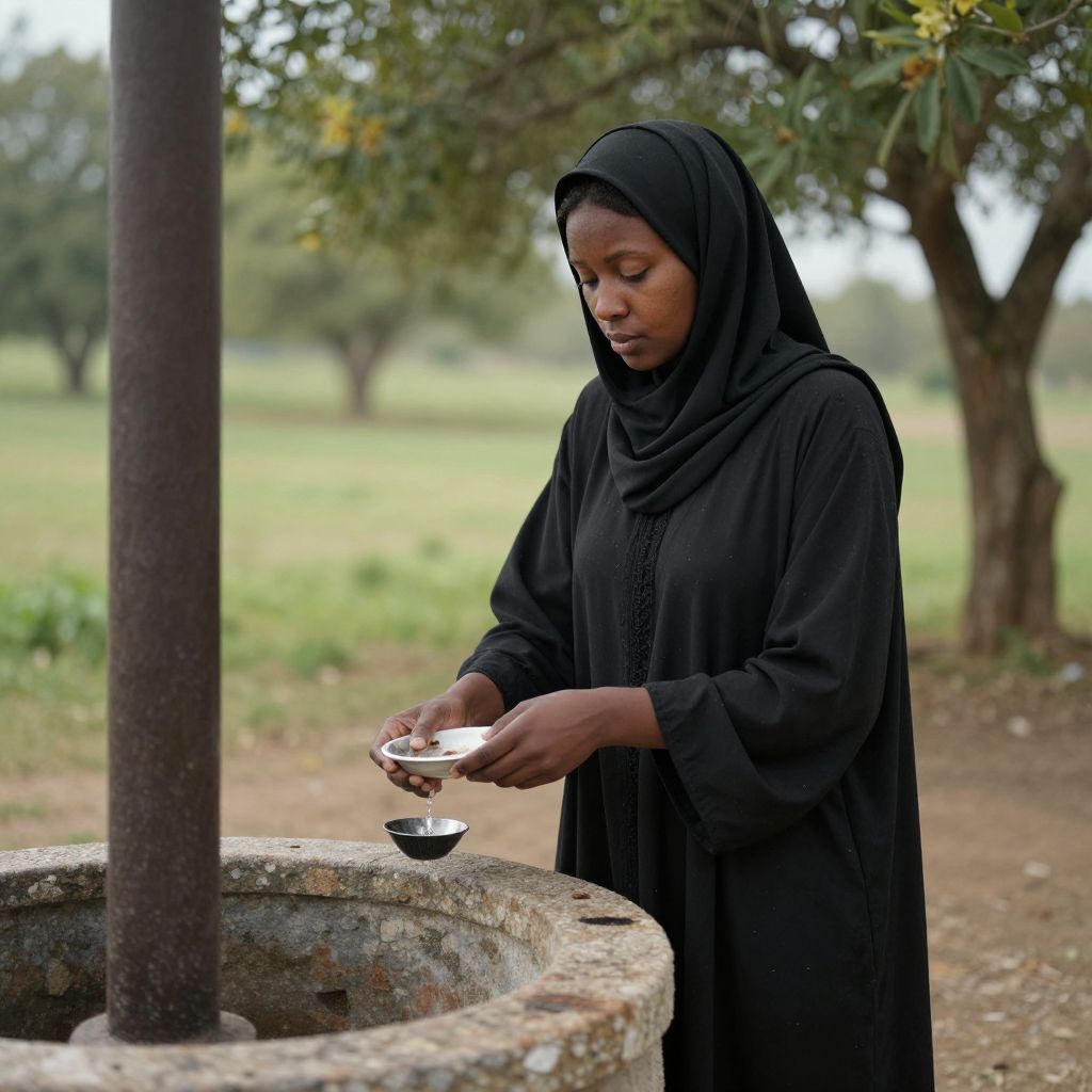 Photograph of a Black woman with dark skin and a slender build, wearing a long, black, modest dress with a headscarf. She is standing outdoors in a grassy area with trees in the background, near a circular stone water well with a metal pipe. She is pouring water from a small white bowl into a black cup. The woman has a focused expression and is looking down at her hands. The scene is natural and serene, with soft daylight filtering through the trees.