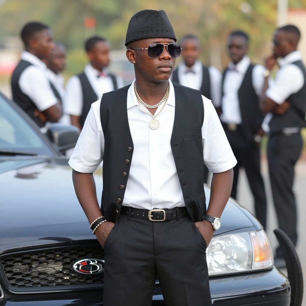 Pimp outfit costume, jewelry, male focus, sunglasses, hat, car, necklace, watch, belt, bracelet, pants, hands in pockets, 1boy, outdoors, vest, multiple boys, blurry background, dark-skinned male, shirt, blurry, ring, motor vehicle, solo focus, dark skin, police car, wristwatch