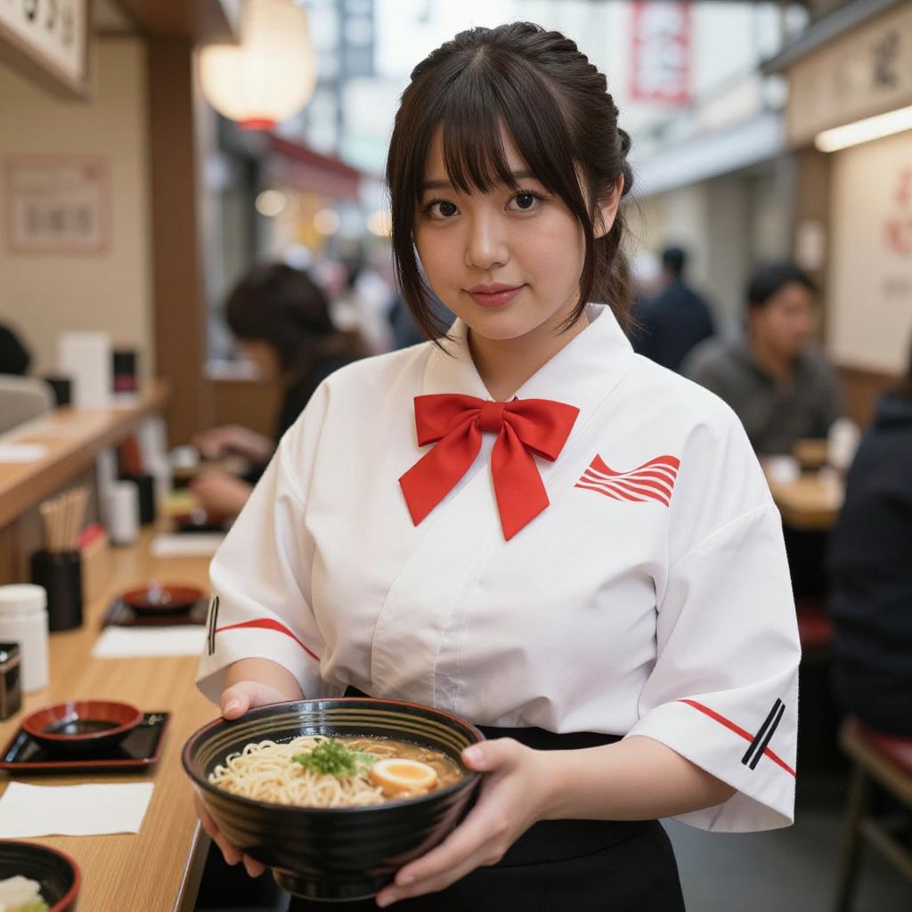 Photograph of an East Asian woman with black hair in a white uniform with red bow, holding a bowl of ramen in a bustling Japanese restaurant.