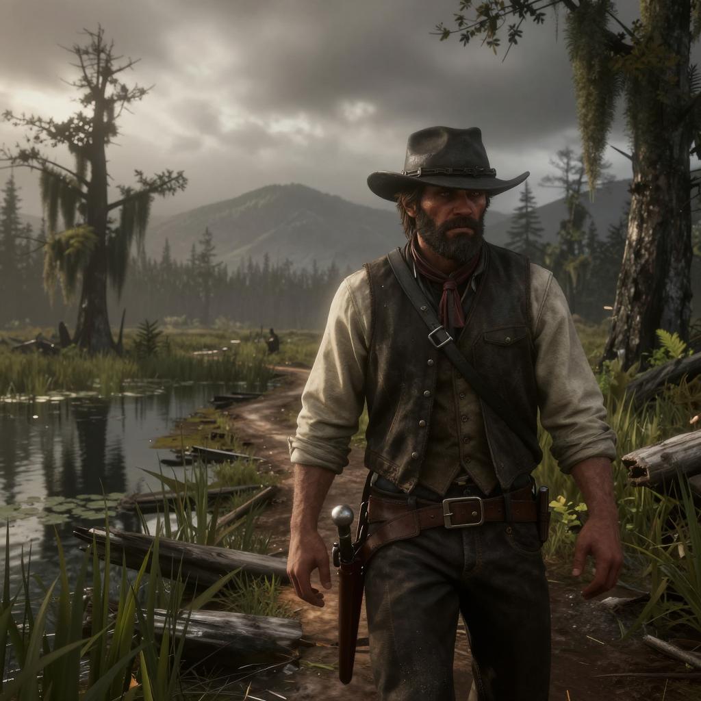 Red dead redemption 2 style, stormy chase across a mountain ridge trail featuring drifter with scruffy beard, patched clothes, and tired eyes in swampy bayou with hanging moss and still, reflective water, moody, softly lit scene with heavy clouds and faint light breaking through, cinematic western lighting, detailed cowboy clothing, atmospheric particles and depth, no gore, ultra-detailed, 4k