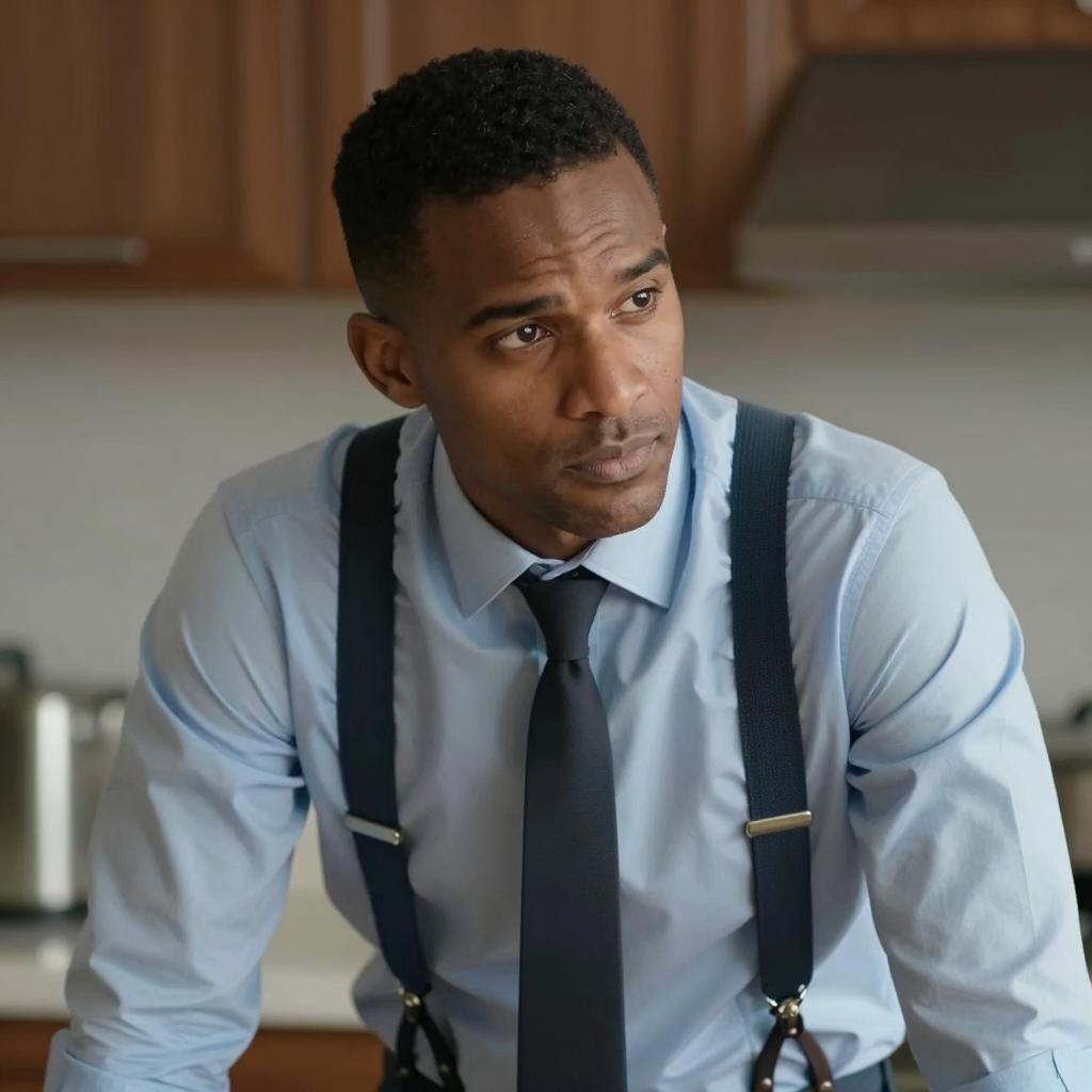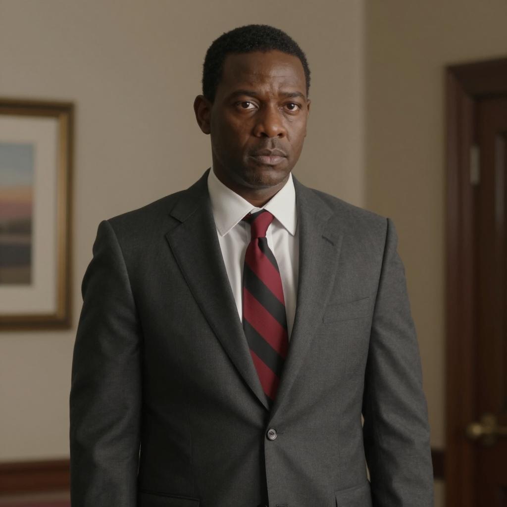 Mid-shot of a man with dark skin and short black hair, partially illuminated by warm light. He has a serious expression and is looking to the right. He wears a light-colored, high-collared shirt. Vertical dark bars frame his face. Background is dark and blurred.